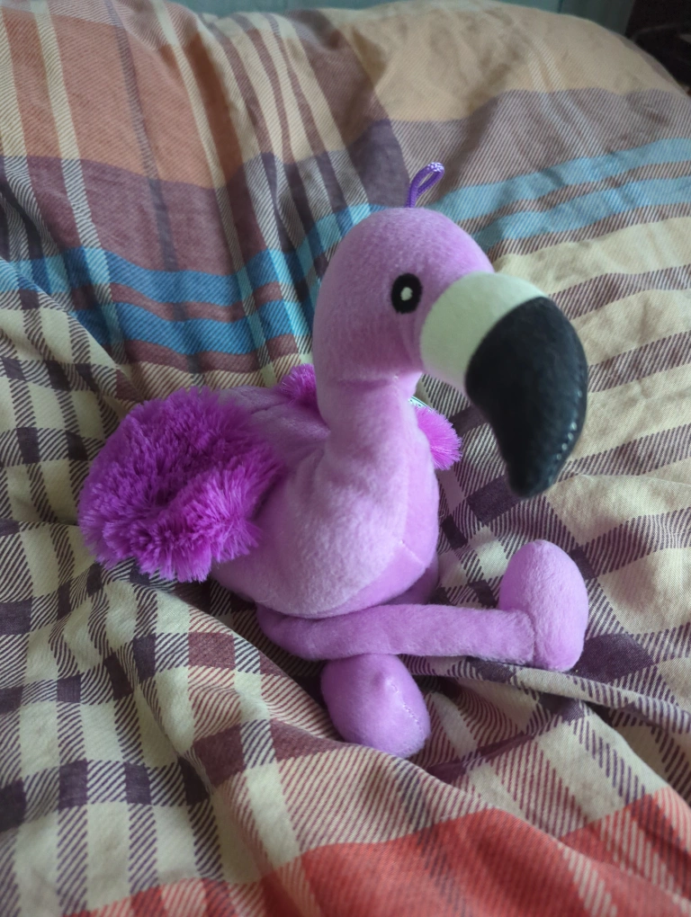 Adorable purple flamingo plush toy. Soft and cuddly. Perfect for kids or collectors.