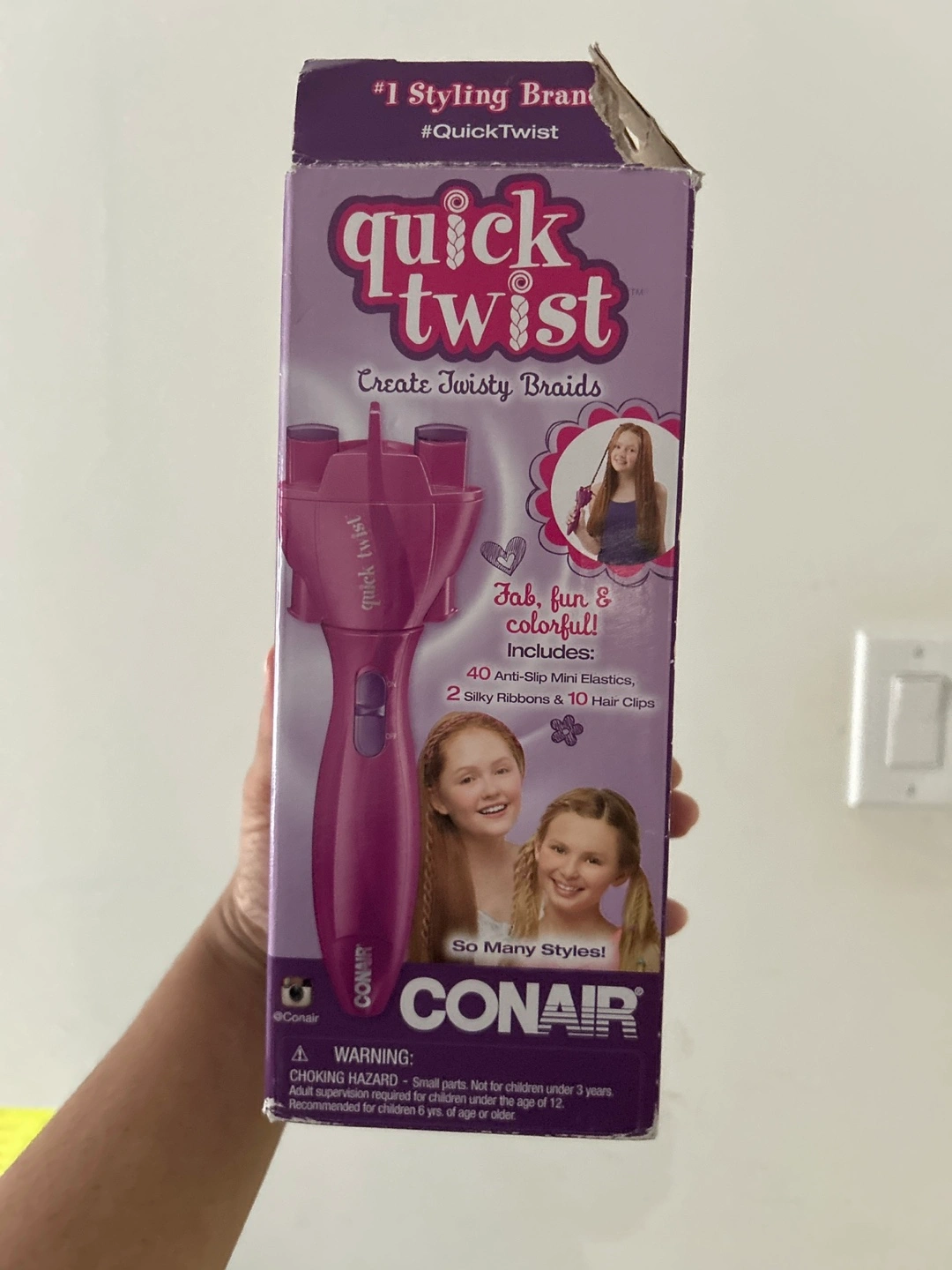 New Conair Quick Twist hair braiding tool. Create twisty braids easily. Includes elastics, ribbons, and hair clips. For ages 6 and up.