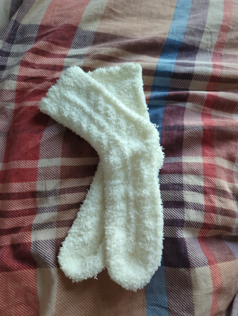 Pair of cozy, cream-coloured fluffy socks. Perfect for lounging around the house. Soft and warm.