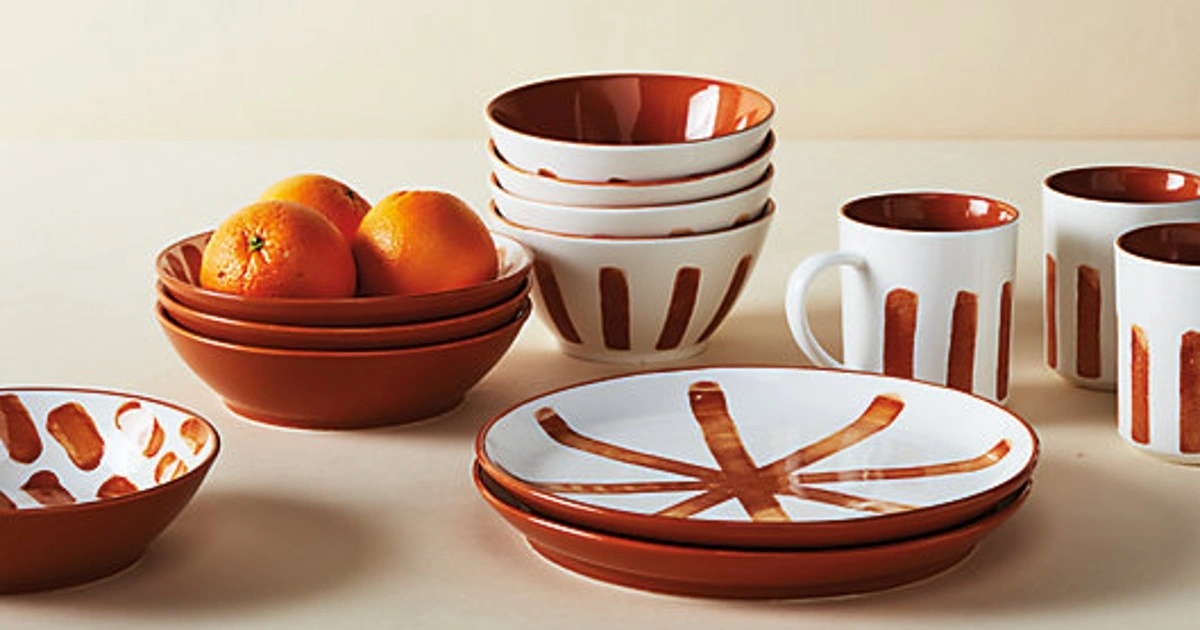 Great condition, 16-piece dinnerware set. Features bowls, plates, and mugs. Unique brown and white design. Perfect for everyday use or special occasions.
