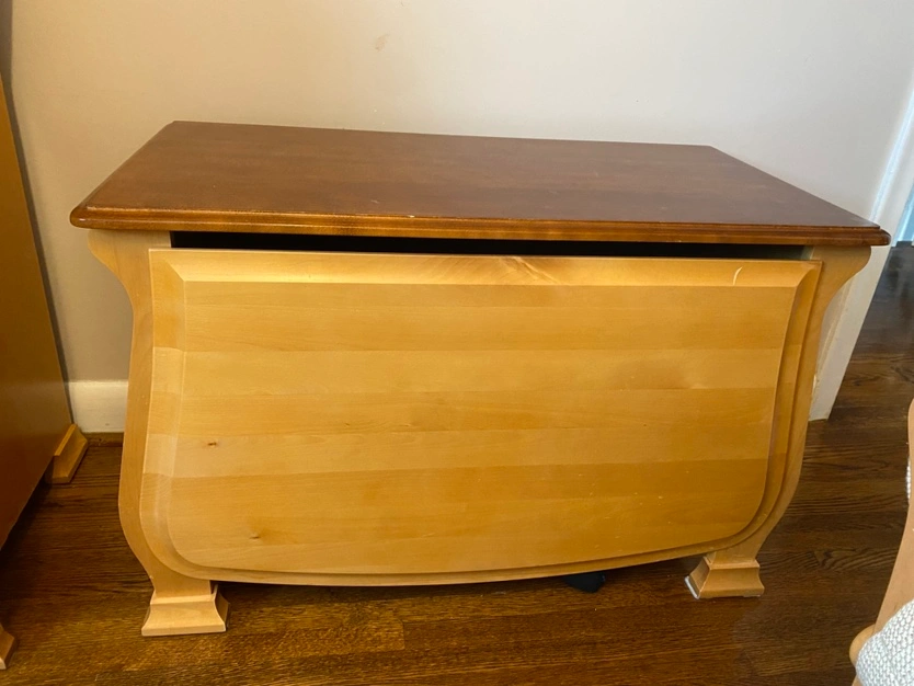 Beautiful light-coloured wood storage chest. Can be used from throw pillows, blankets, or as a toy chest. Features a lift-top lid with brass hinges. Beautifully made in Canada. Great storage solution with beautiful detailing. Please refer to pictures of condition and construction details. Some minor wear from use. This is a heavy piece.
