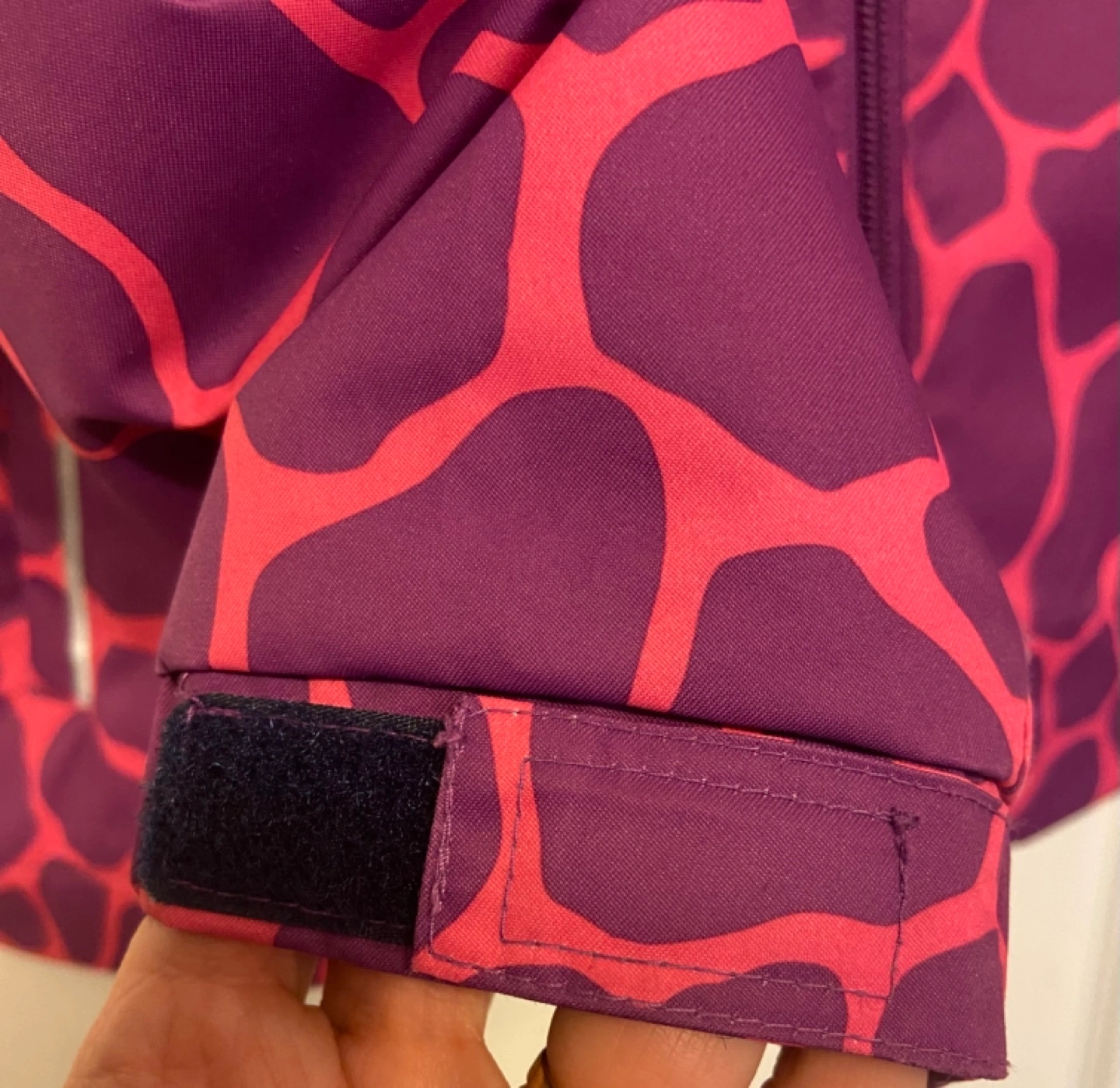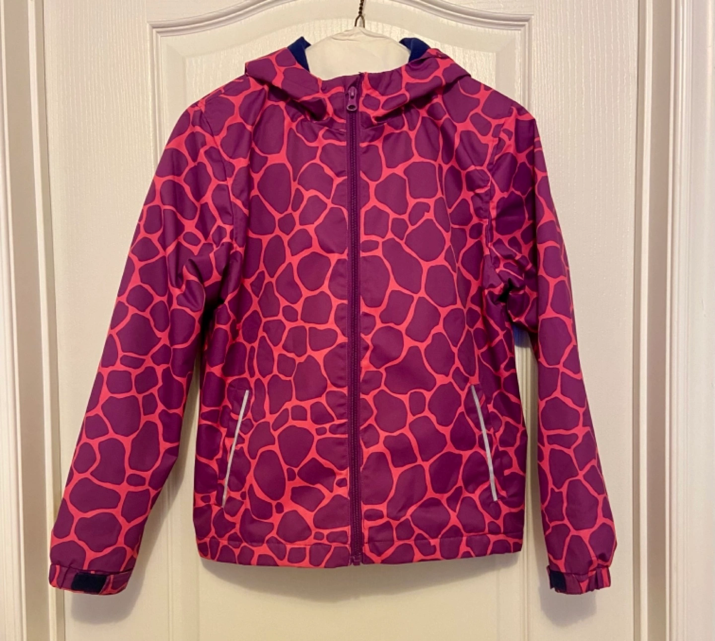 1000+Adorable girls' Fall jacket. Features a vibrant pink and purple giraffe print. Zipper closure, hooded. Elastic cuffs plus Velcro and strap to adjust perfectly and hem. Side pockets. Size listed is US 8/9. Excellent condition. Purchased for $49.99+ This jacket was worn a handful of times so it is in perfect condition - inside fleece has no wear and tear either - like new!