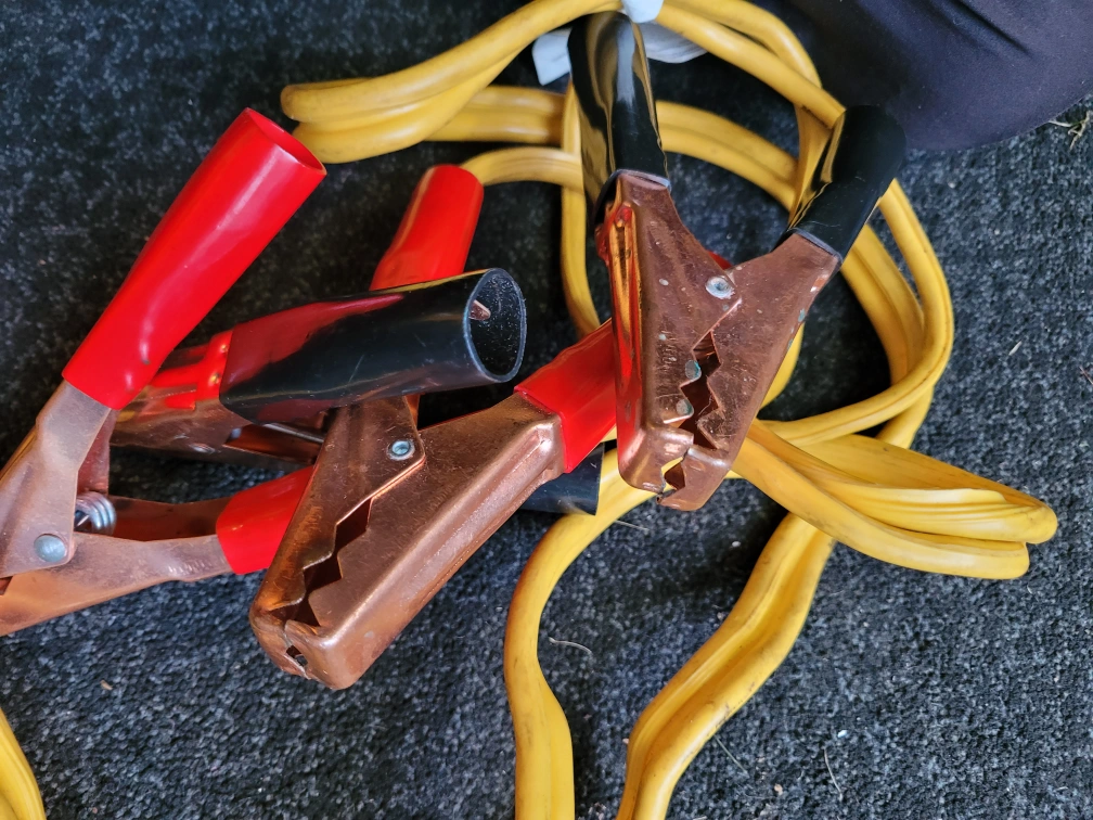 Booster cables. Yellow cables with red and black large clamps. Great for roadside emergencies. Used but in good condition.