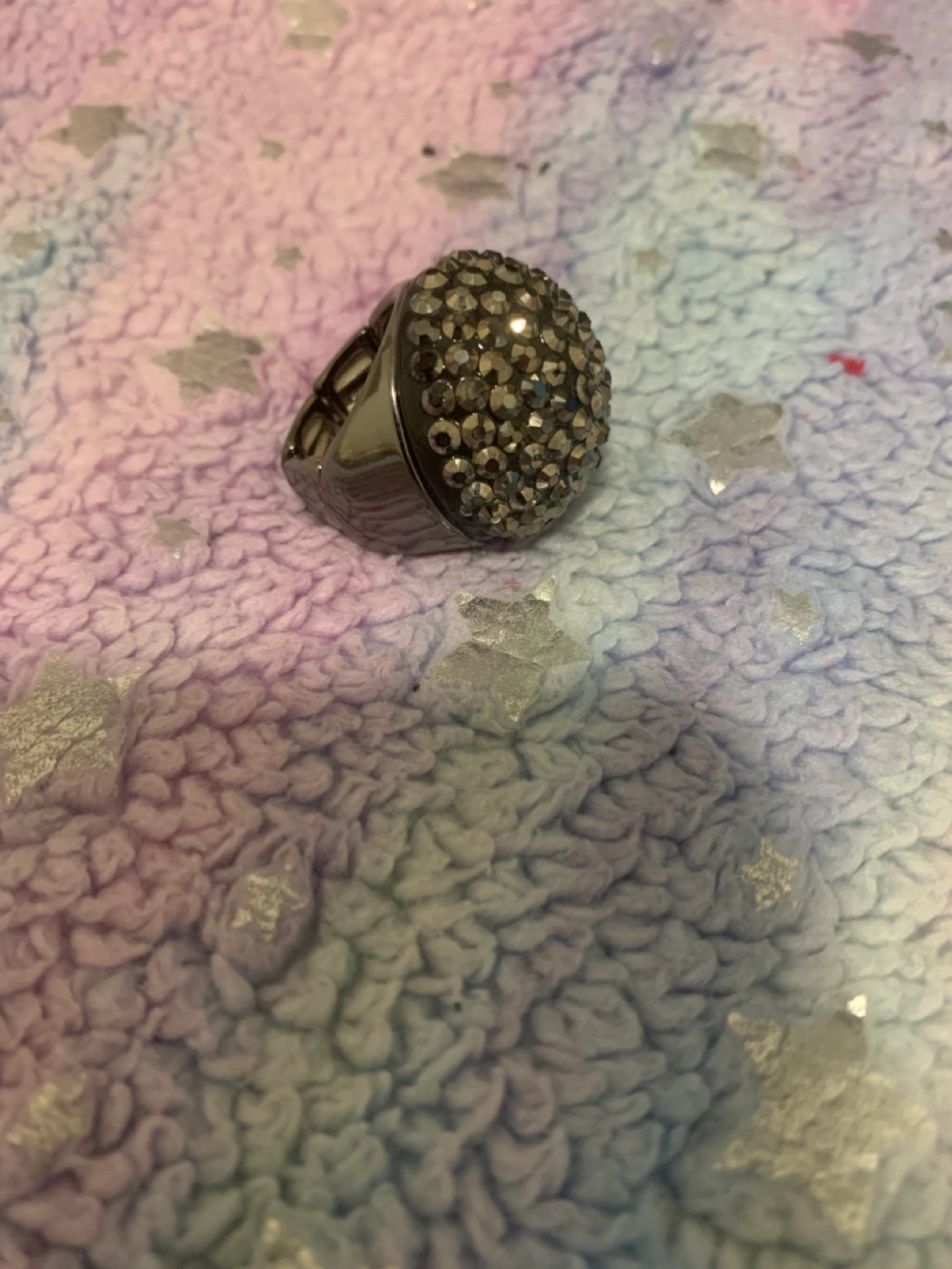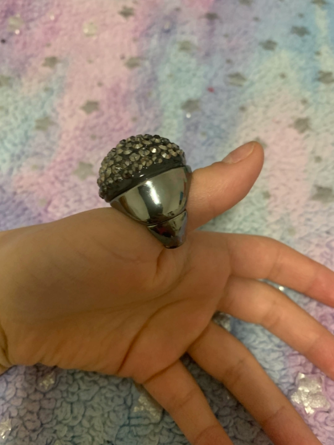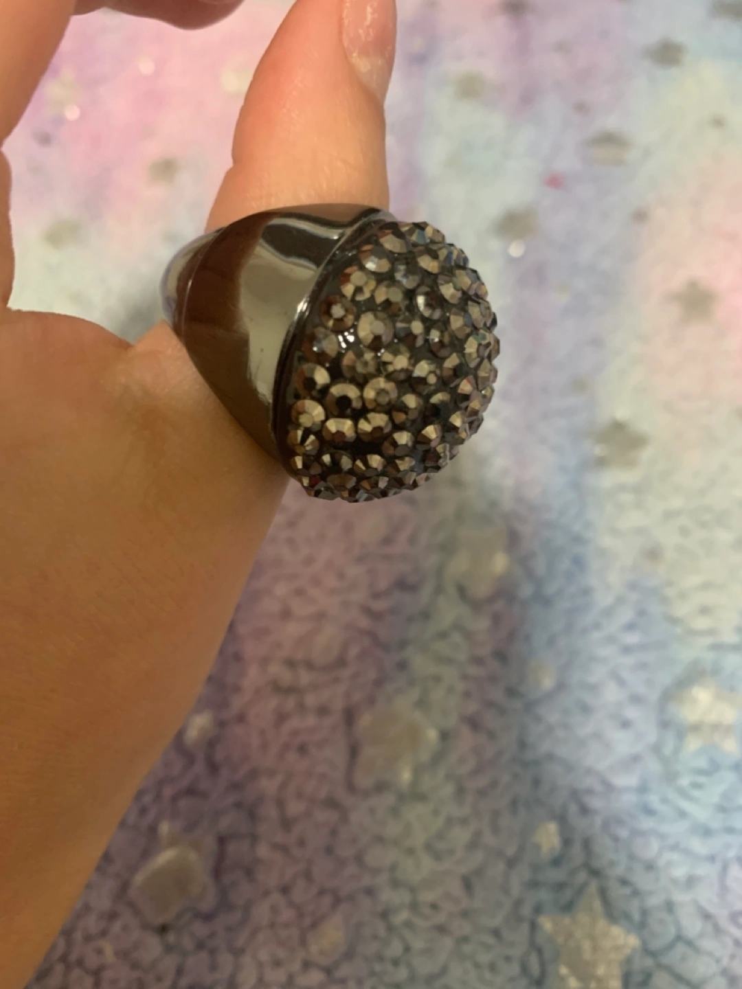 Unique ring. Features a large, dome-shaped setting covered in dark grey rhinestones. Gunmetal-coloured band. Eye-catching piece for adding a touch of sparkle to any outfit.