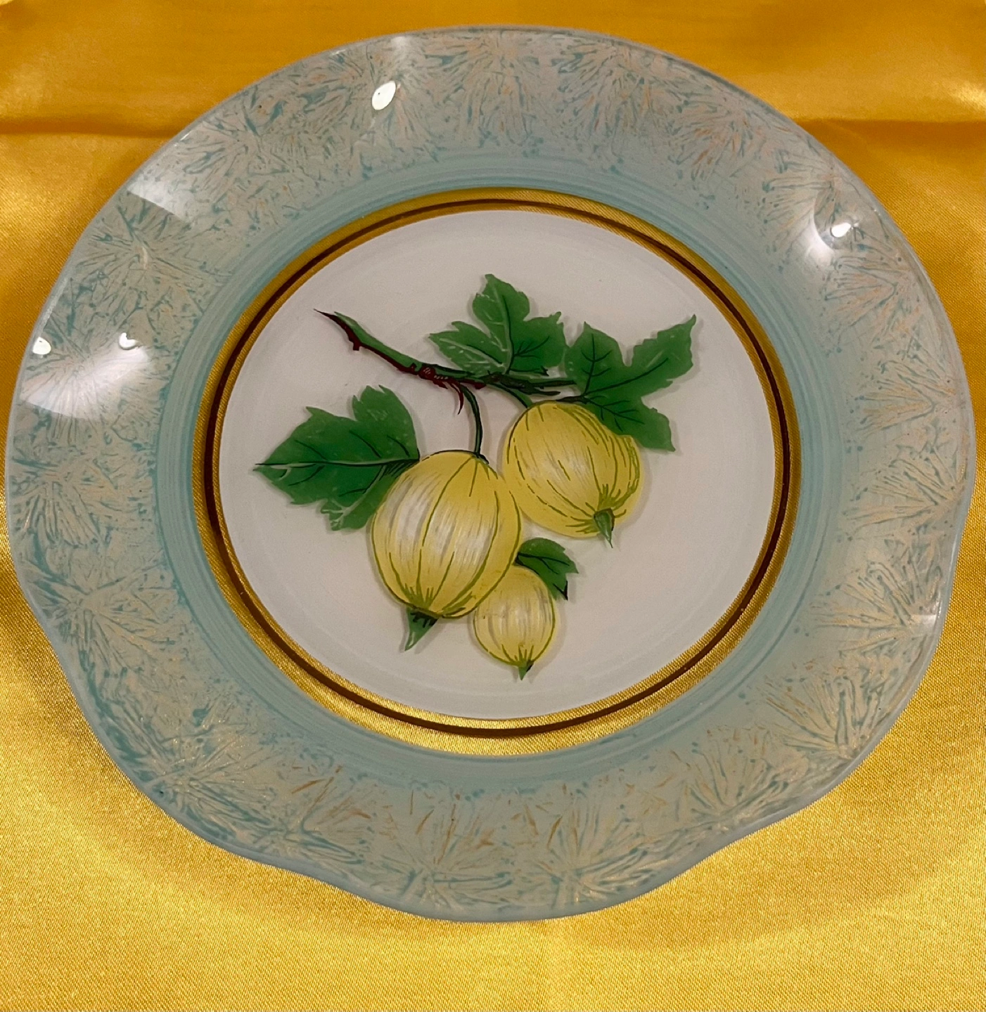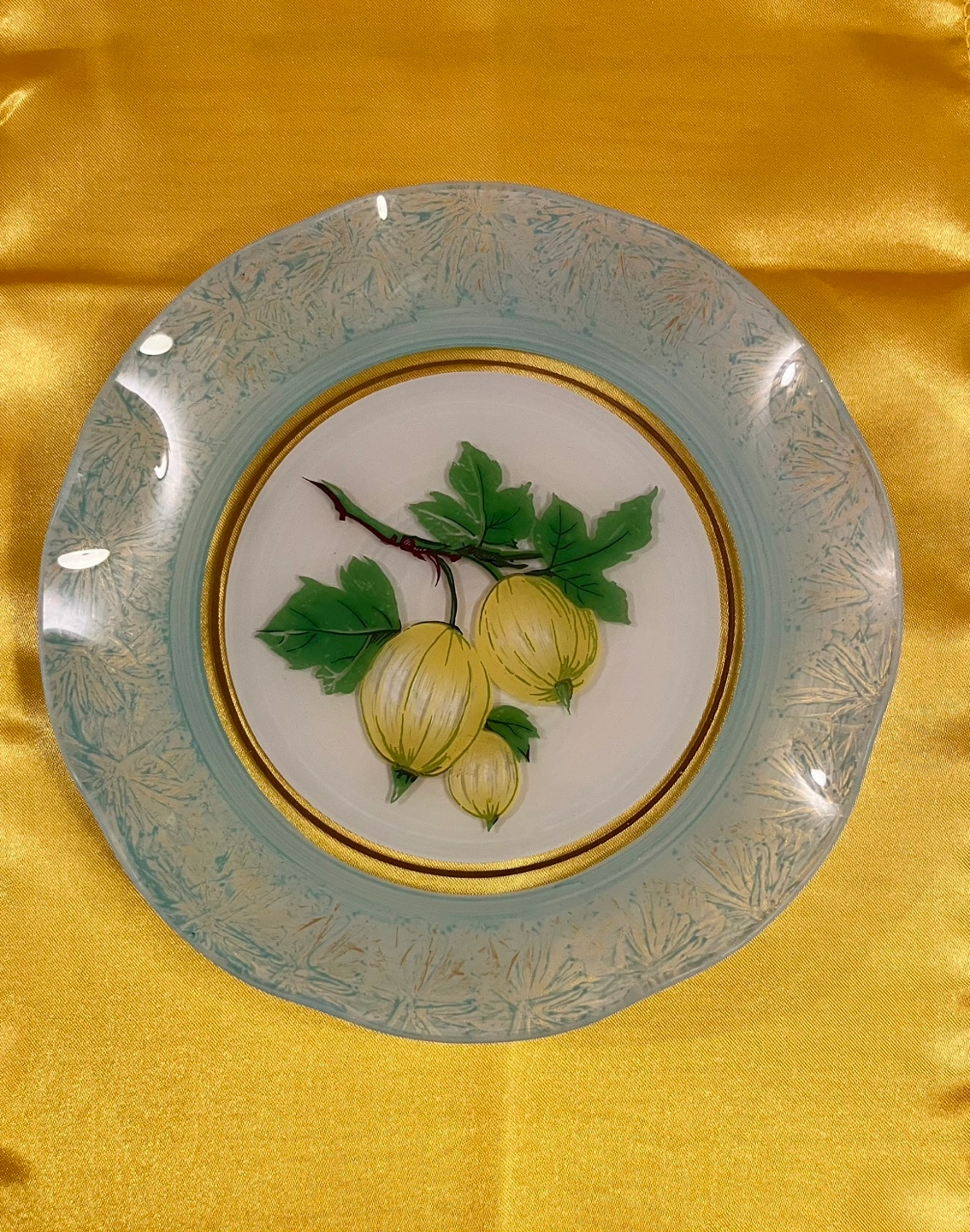 Decorative glass plate. Features a painted gooseberry design. Light teal colour. Gold accents. Scalloped edges. Unique and collectible.