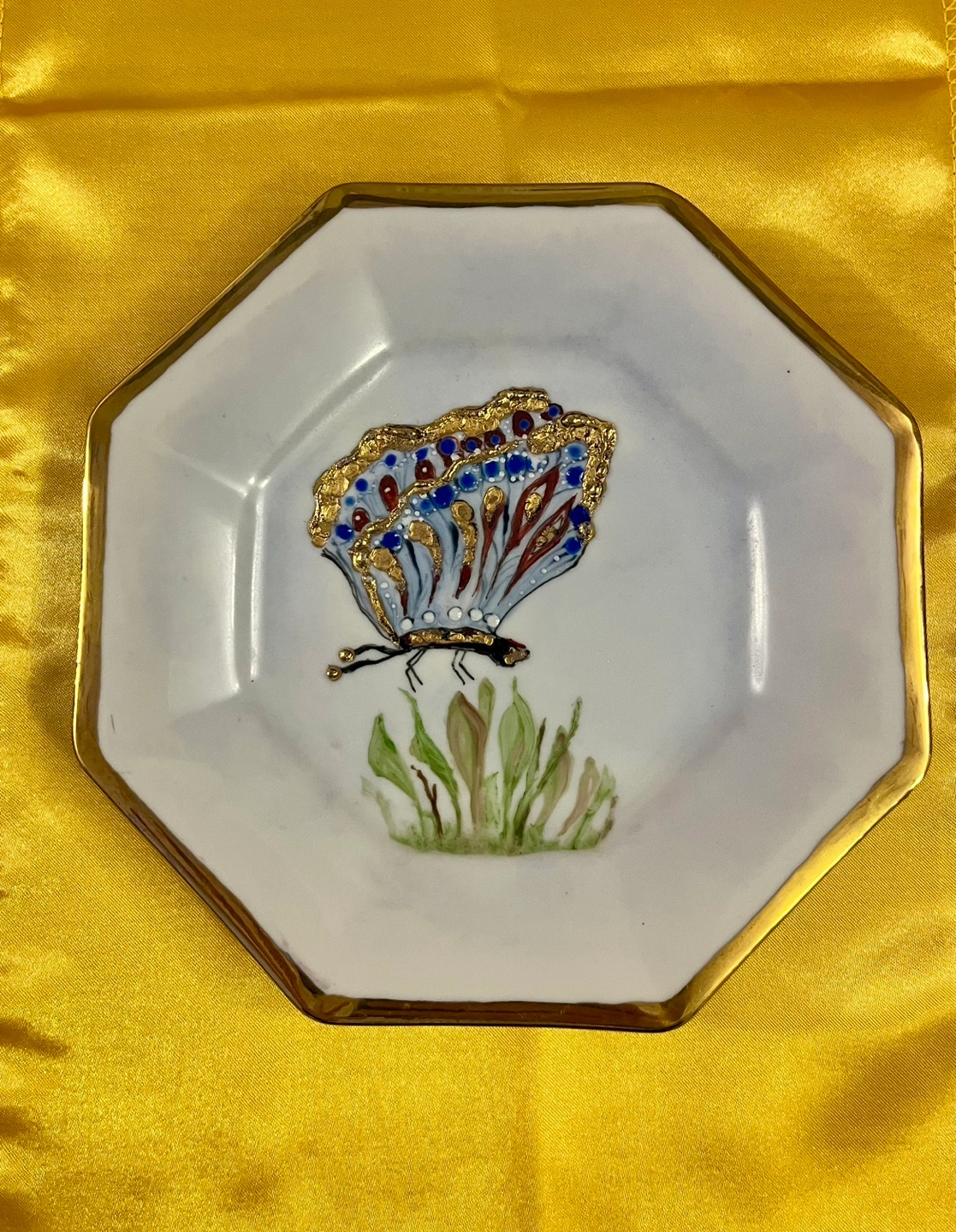 Vintage octagonal plate. Hand-painted butterfly design. Gold accents. Signed and dated 1988. Unique collectible.