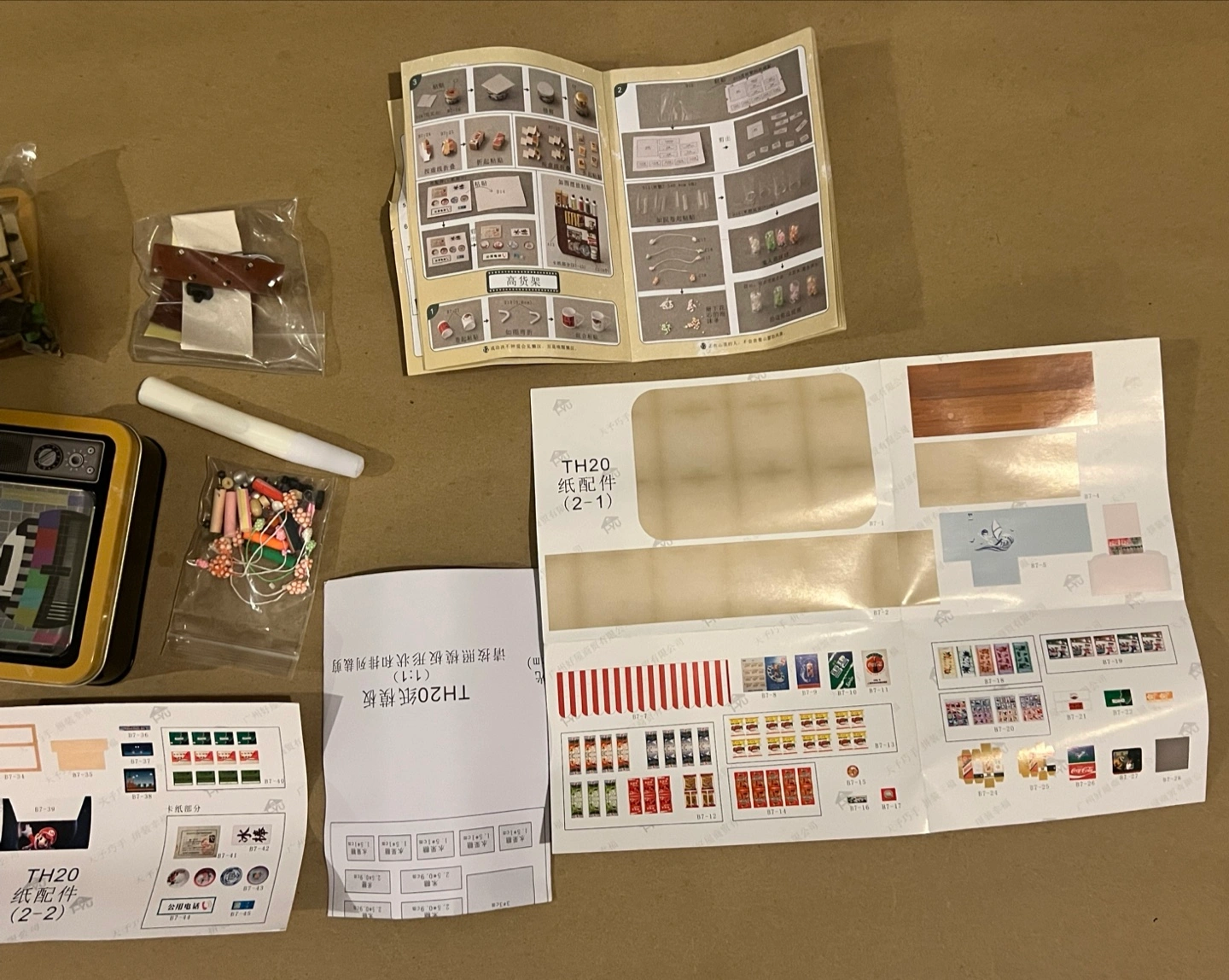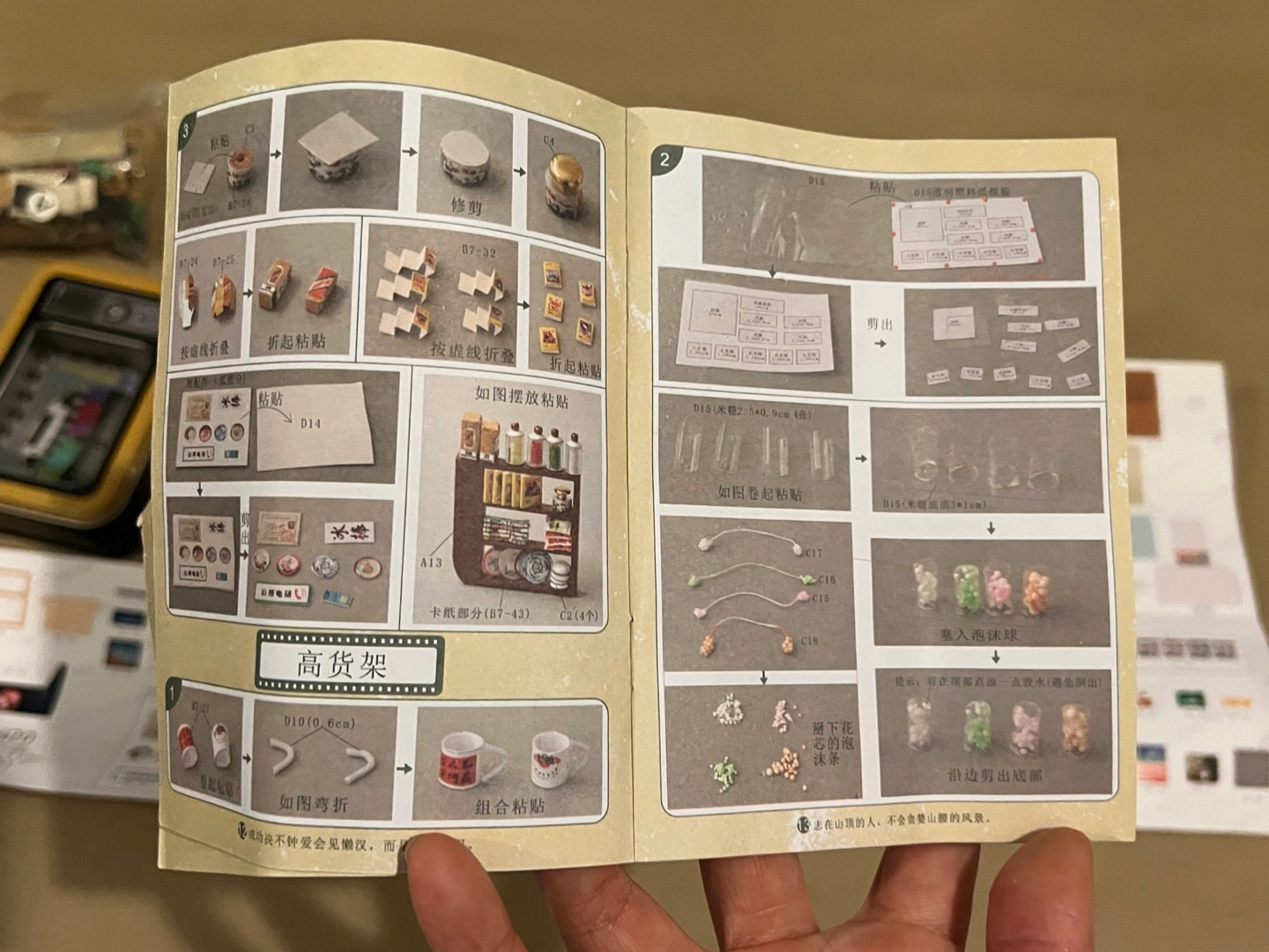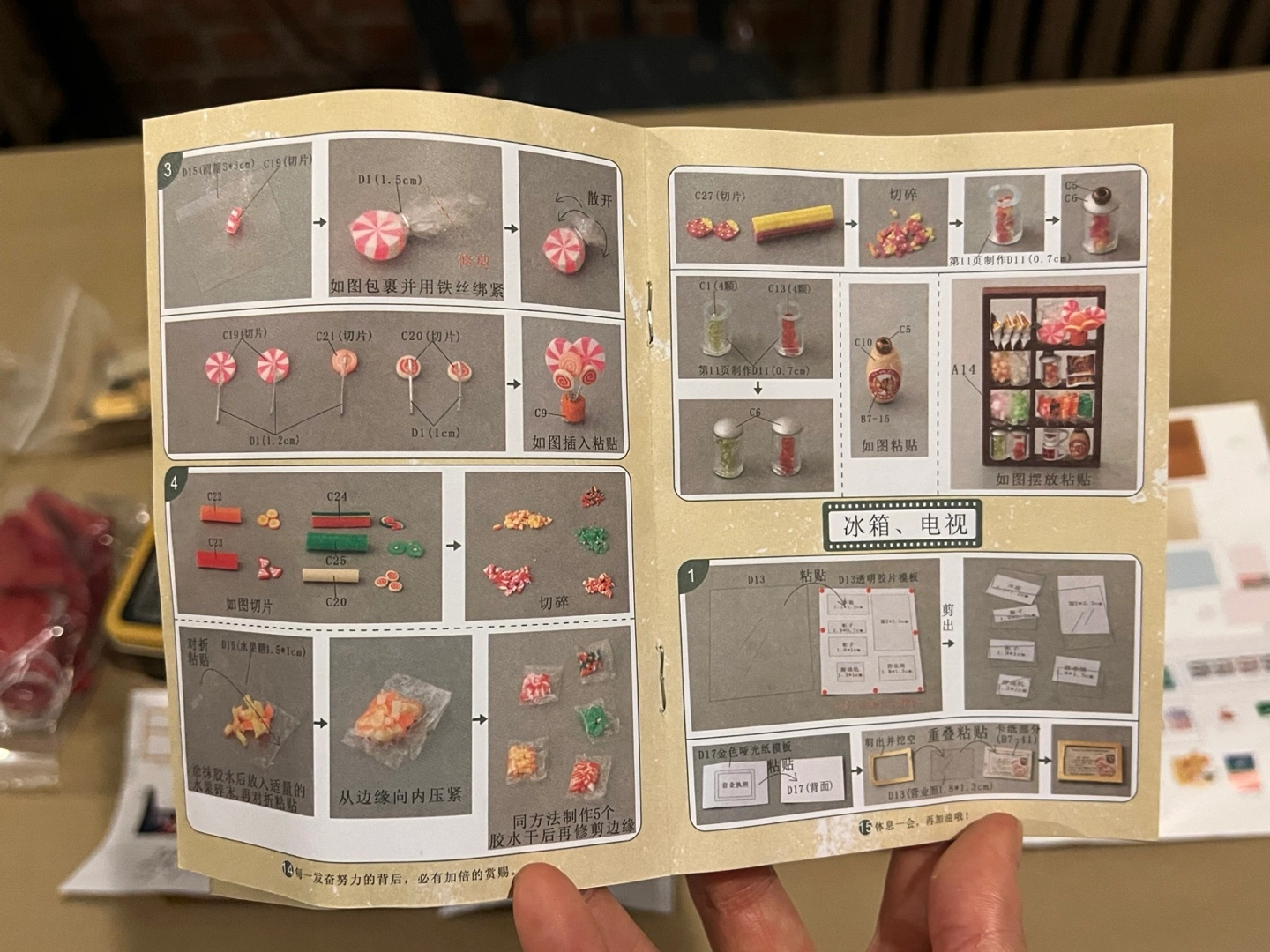 A DIY miniature candy shop diorama in a metal box. All materials provided including glue and ruler and sewing supplies. The writing is all in Chinese but the instructions show pictures with each step so no Chinese reading skills are needed.