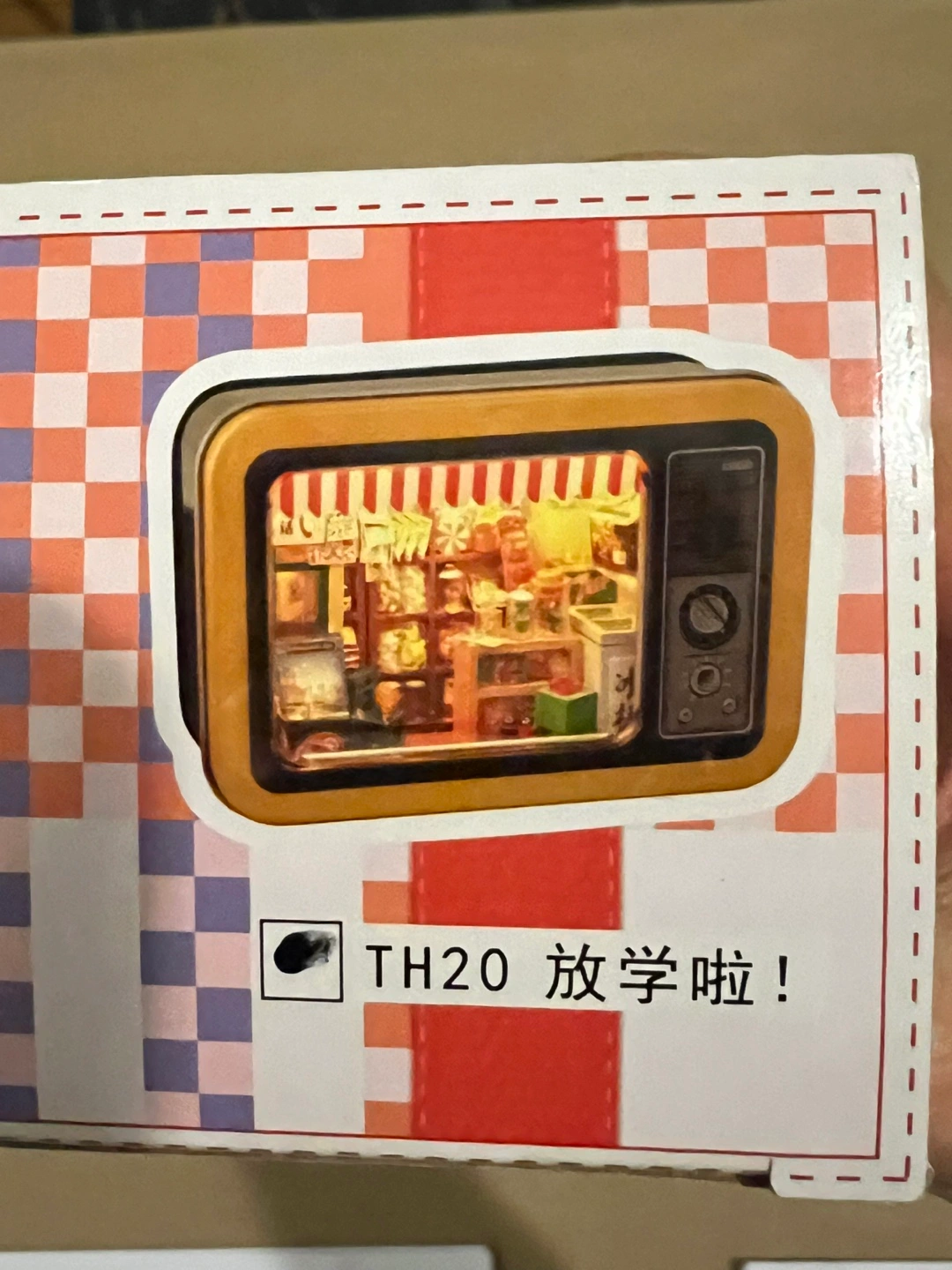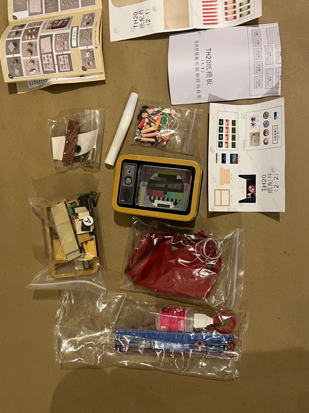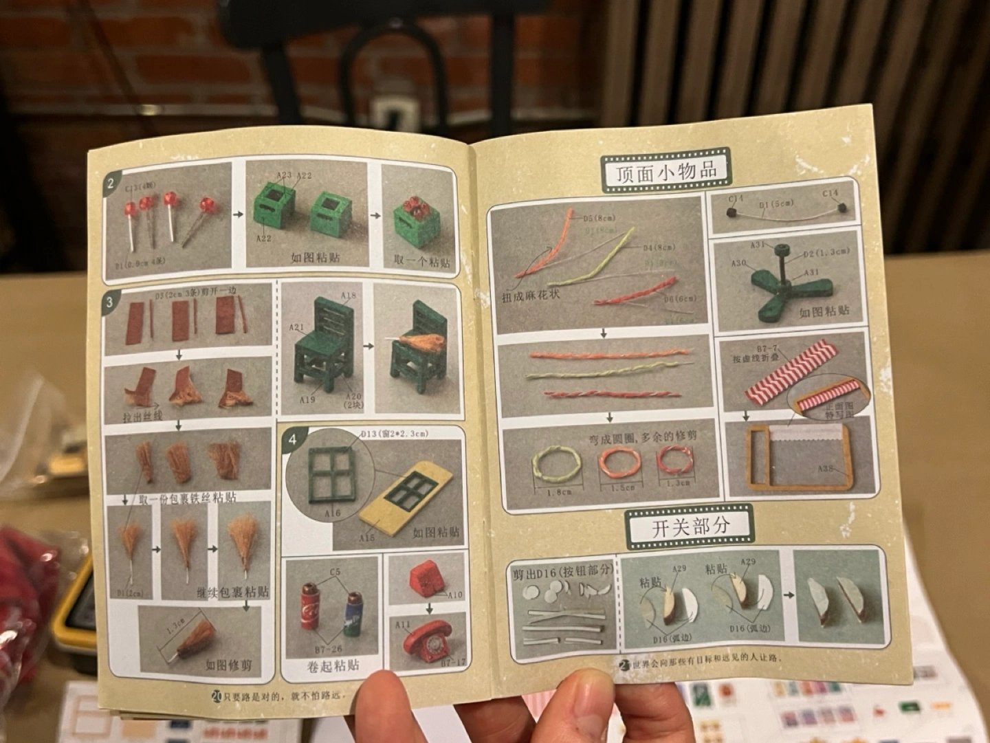 A DIY miniature candy shop diorama in a metal box. All materials provided including glue and ruler and sewing supplies. The writing is all in Chinese but the instructions show pictures with each step so no Chinese reading skills are needed.