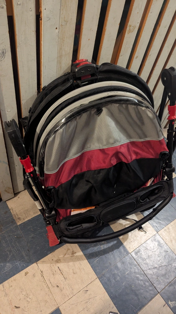 Selling Schwinn Joyrider Double Bicycle Trailer. It is in great condition. Some wear and tear from regular use, but no holes, no broken parts or any rips. There is only one black stain in the plastic part (last pic) but it doesn't affect functionality. Folds and the wheels come out for easy transportation and storage.