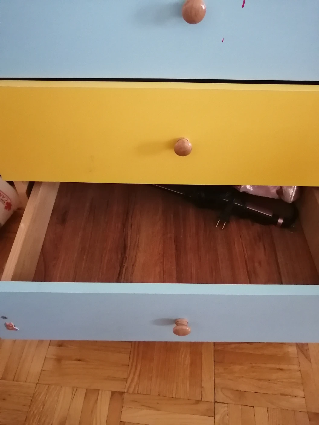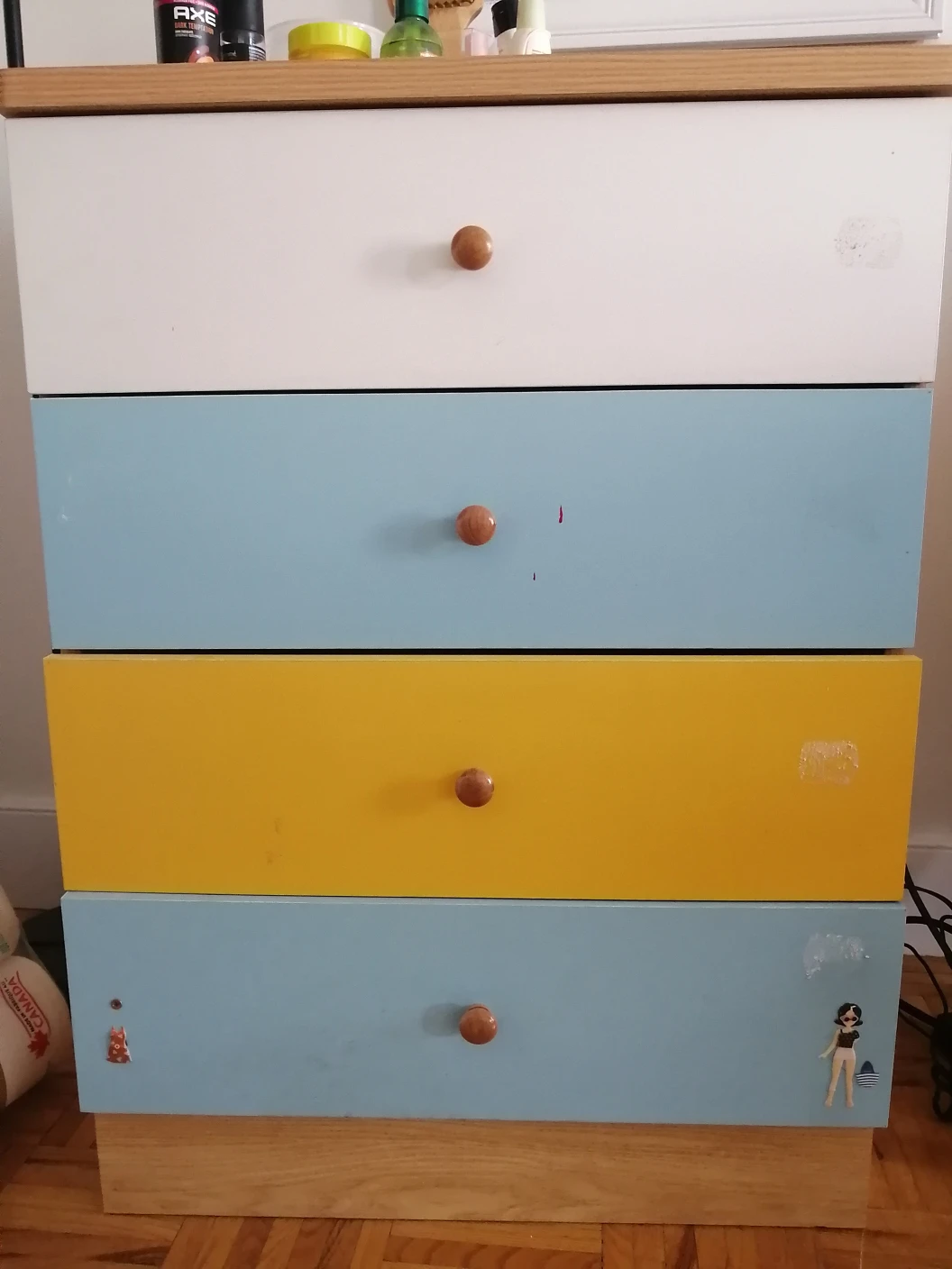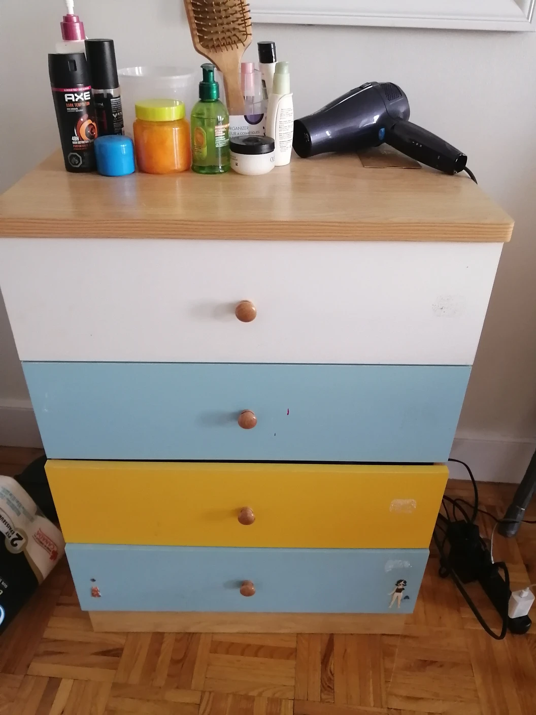 Cute four-drawer dresser. Multicoloured drawers. Wooden knobs. Some minor cosmetic wear. Perfect for a child's room or small space.