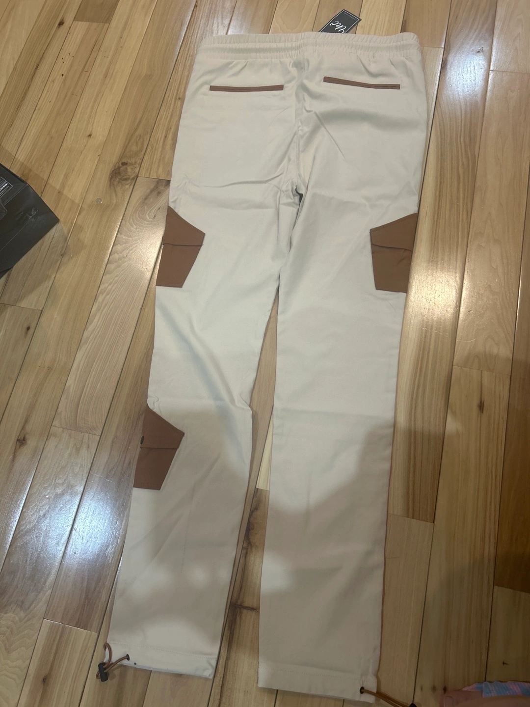 Beige cargo pants. Features brown leather accents. Drawstring waist. Multiple pockets. New with tags.