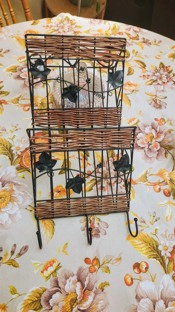 49Two-tiered mail holder. Metal frame with woven wicker accents. Features decorative leaf details. Includes hooks on the bottom. 20cm wide, 25cm long.