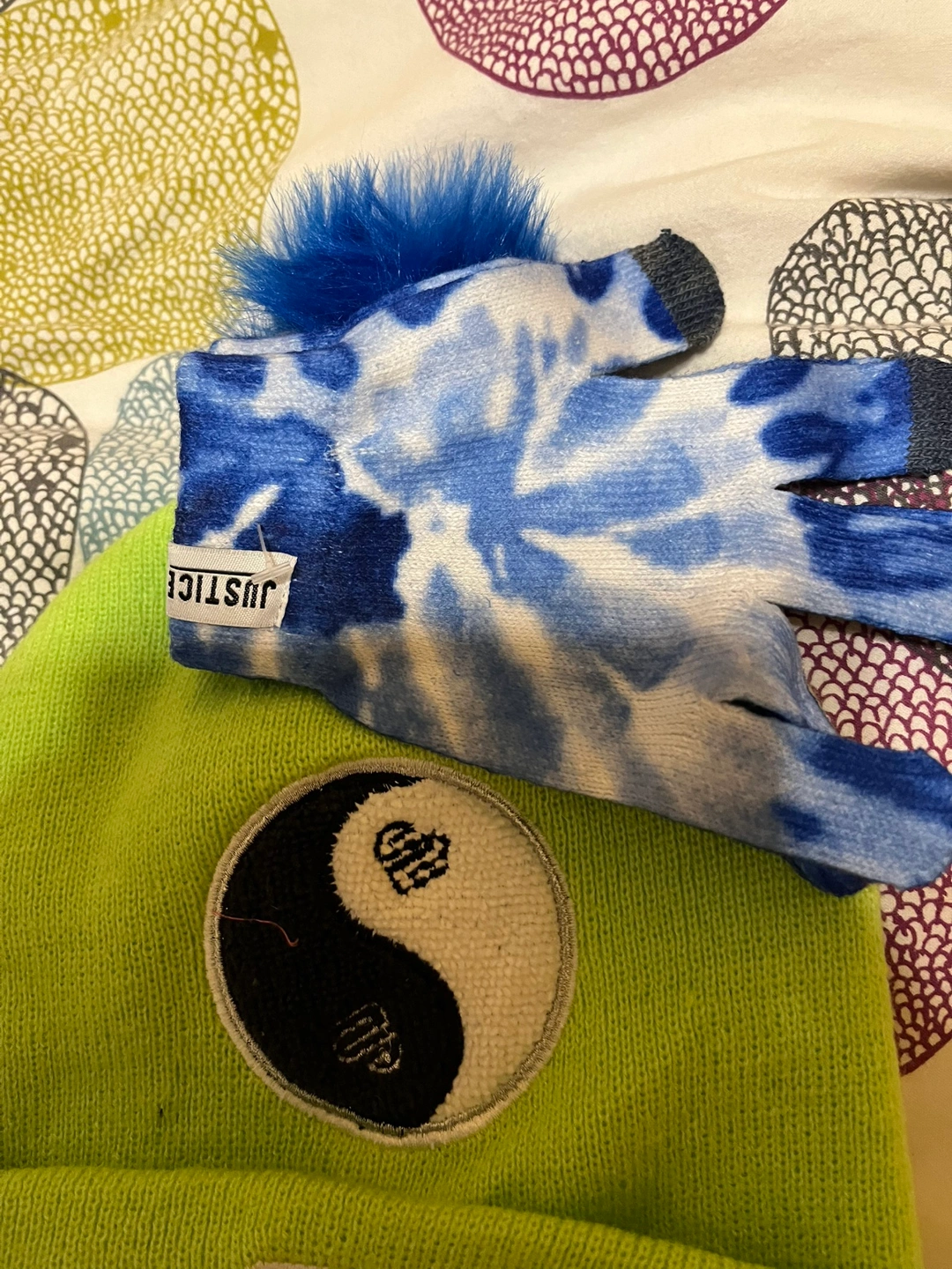 Lime green beanie featuring a yin-yang design. Matching blue tie-dye fingerless gloves with a fuzzy blue pom-pom. Perfect winter accessory set.