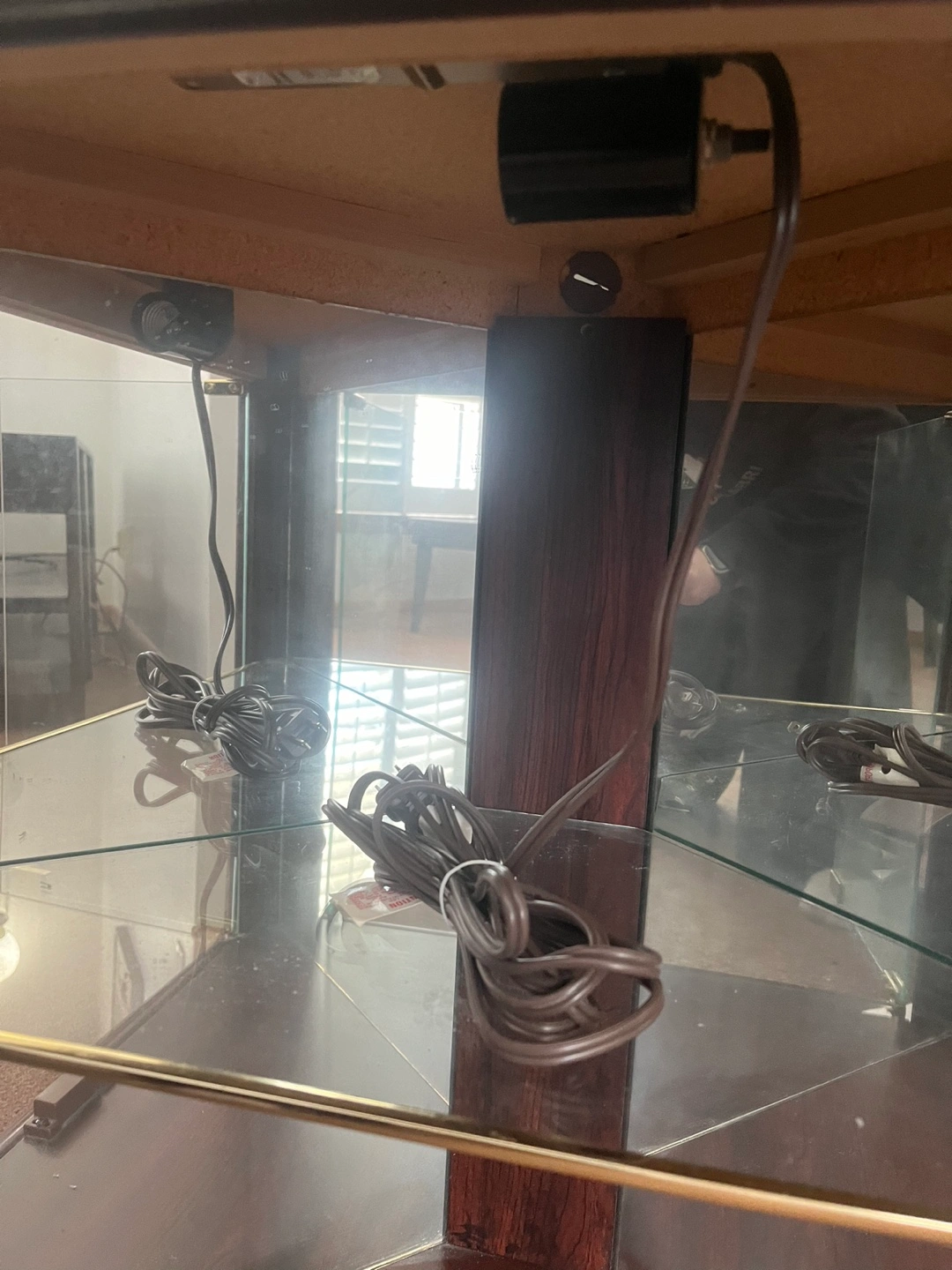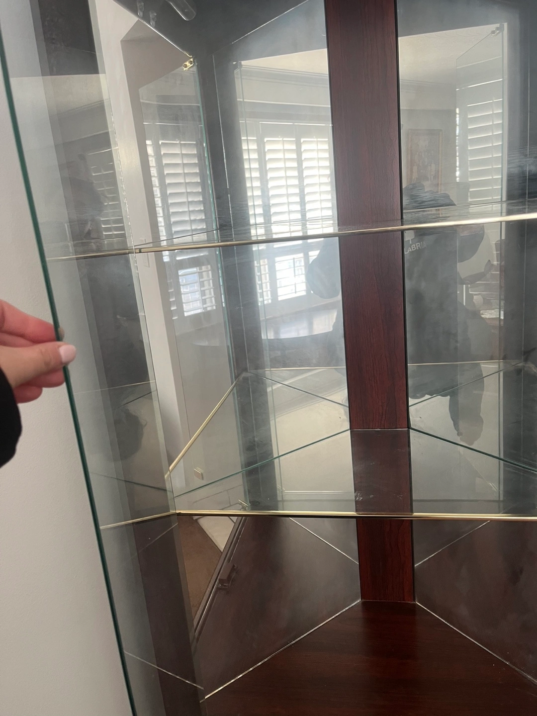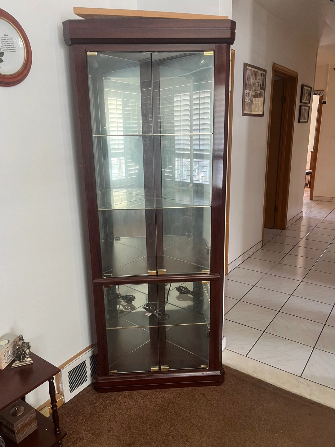 Dark brown wooden corner curio cabinet. Glass shelves and doors. Interior lighting. Good condition.