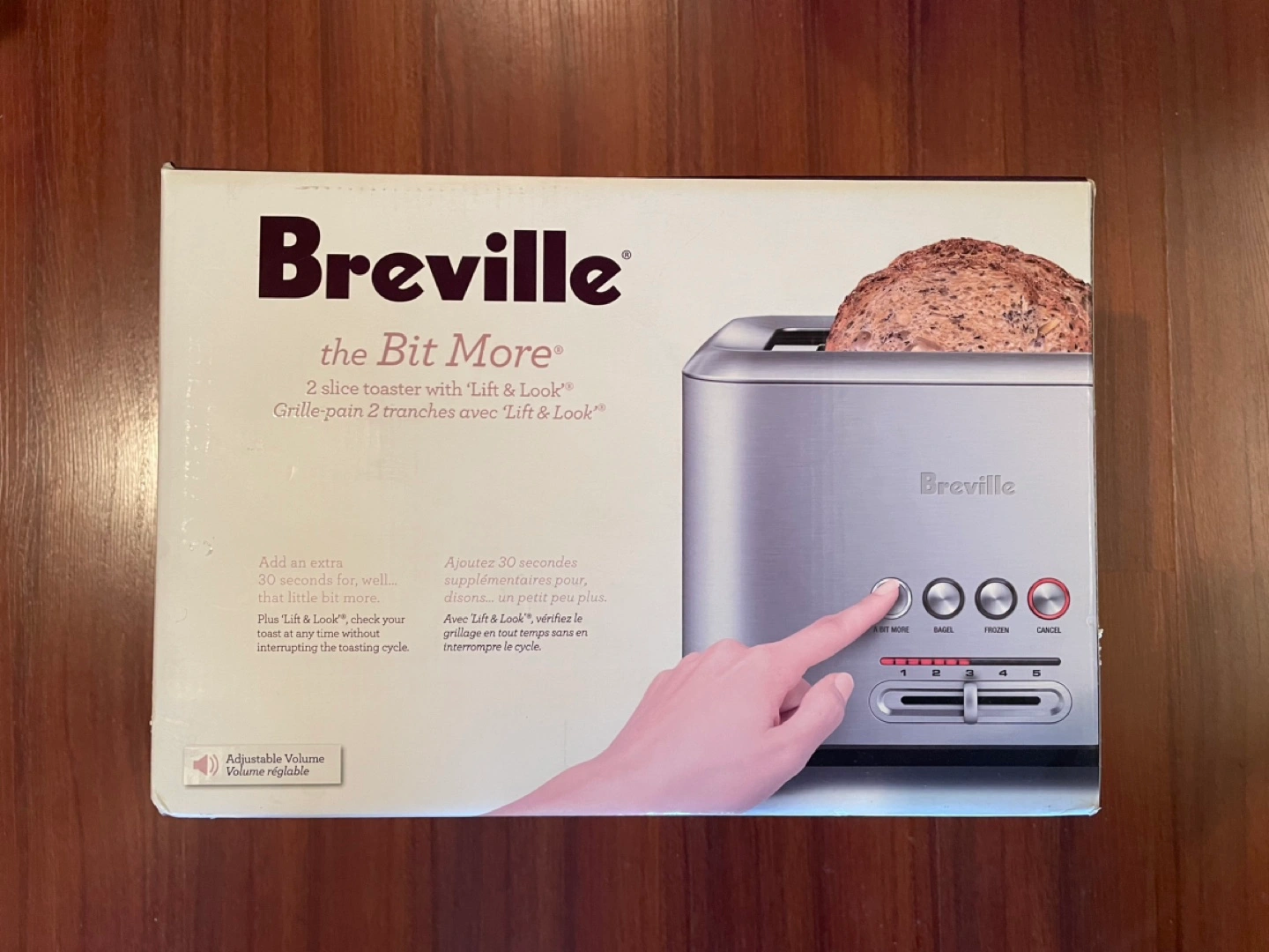 Brand new, in box. 2-slice toaster. Brushed stainless steel finish. Features Lift & Look functionality. Adjustable volume control. LED display shows countdown. Includes extra-wide slots. Concealed cord storage.