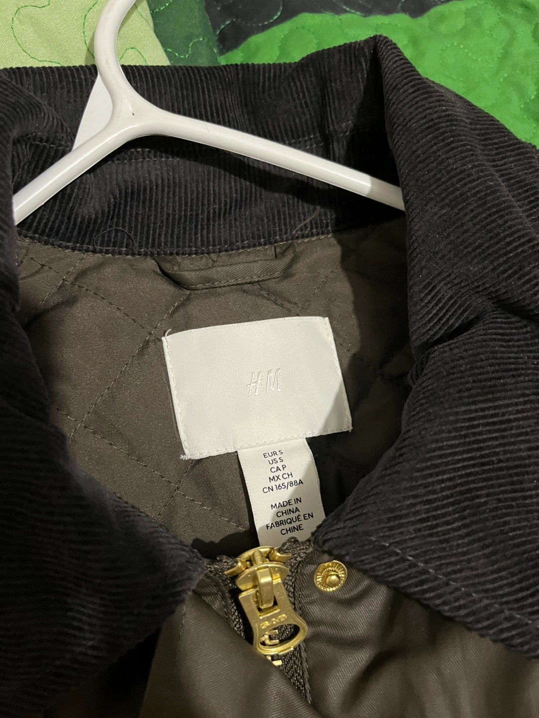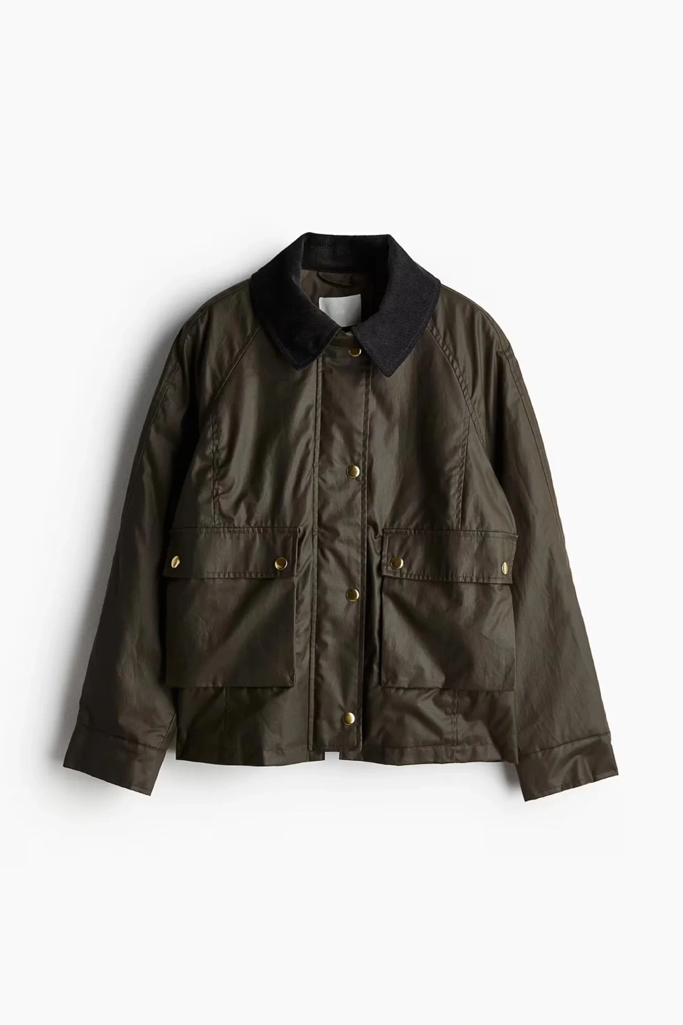 Women's olive green waxed cotton jacket. Features corduroy collar, multiple pockets, and gold-toned buttons. Zip and button closure. Size small (slightly oversized )