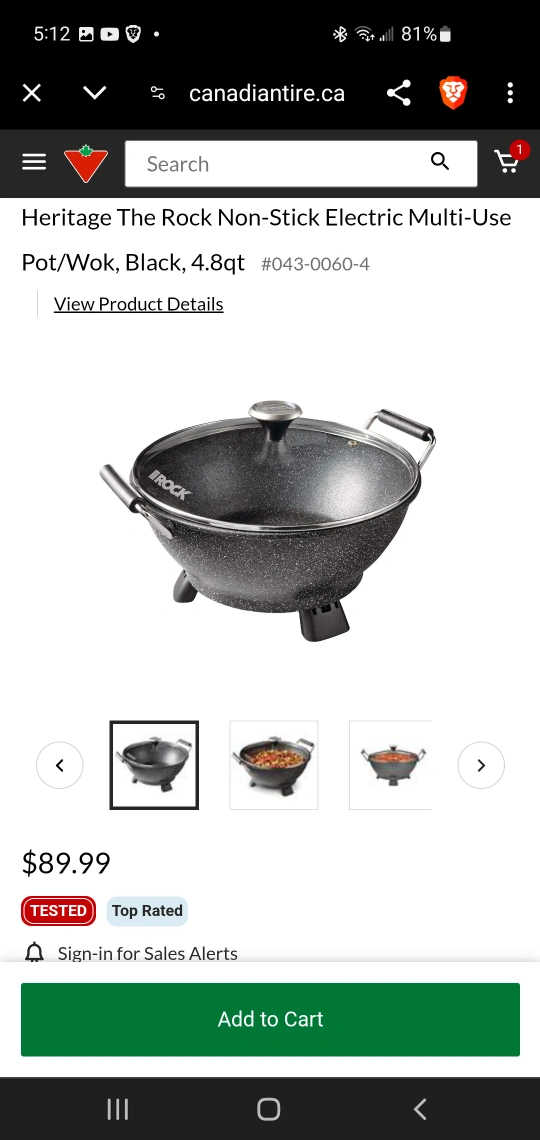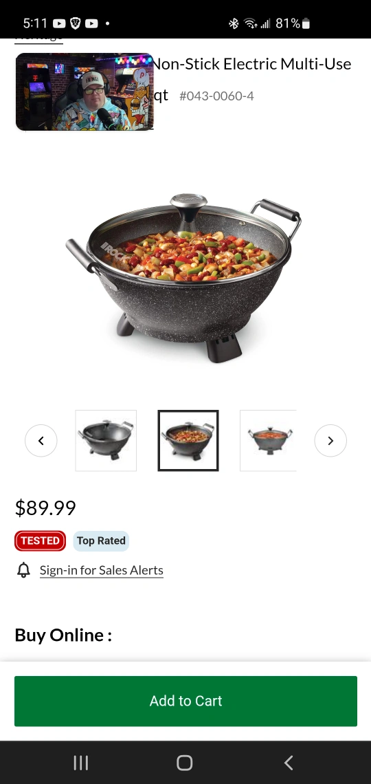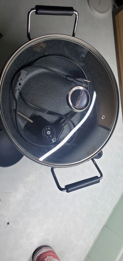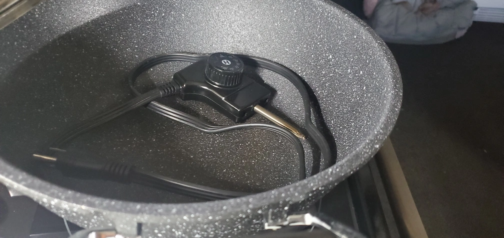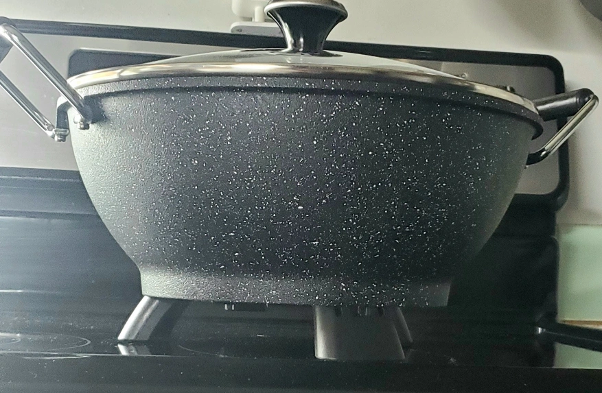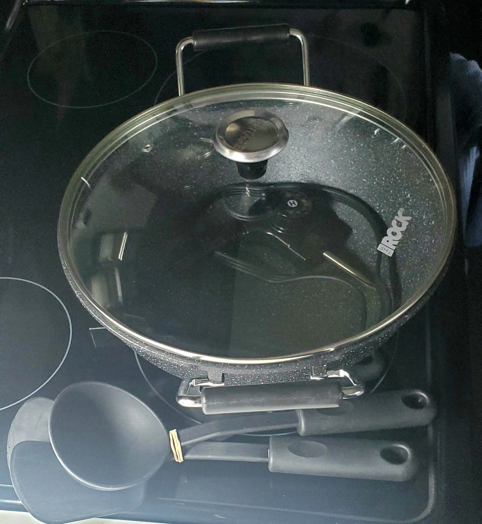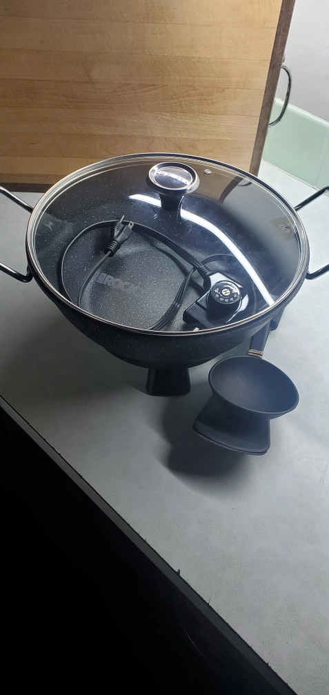 Electric multi-use pot/wok. Non-stick surface. Includes lid , spatula and ladel. Black, 4.8qt capacity. Great for everday use and for camping or in trailer . Husband use for out of town work