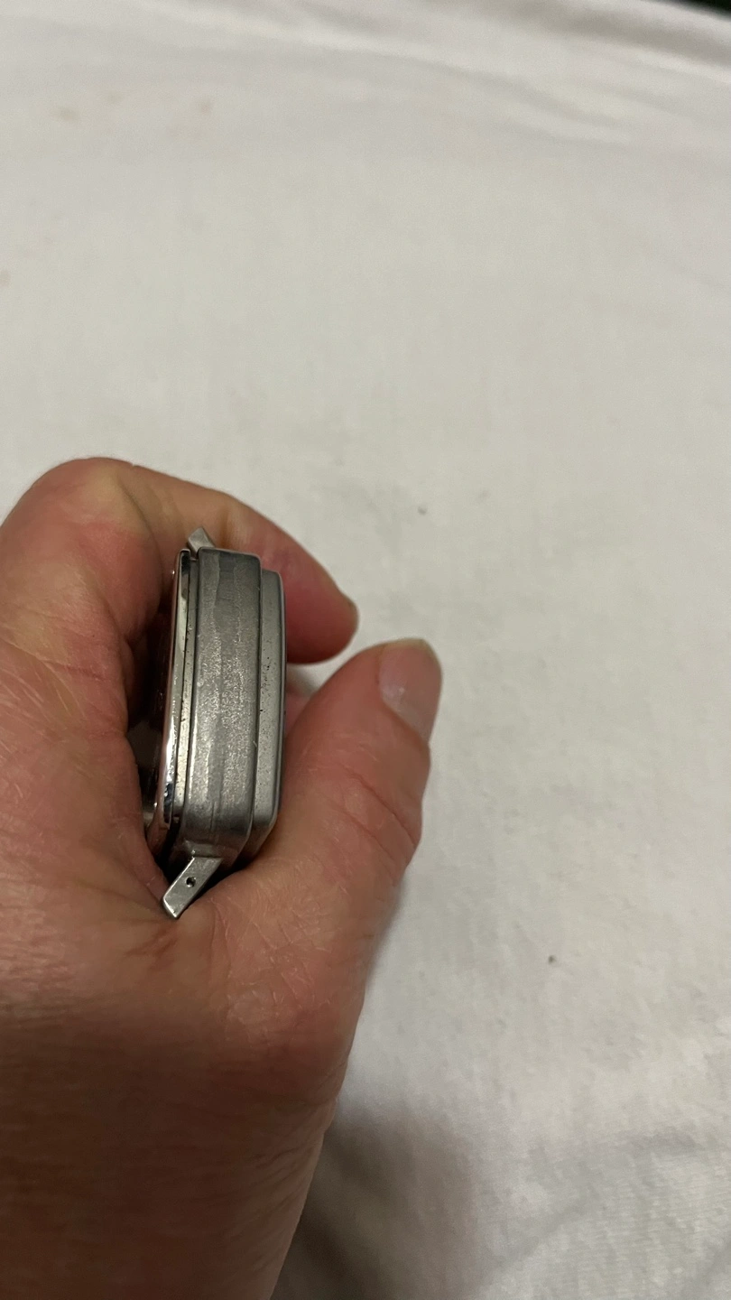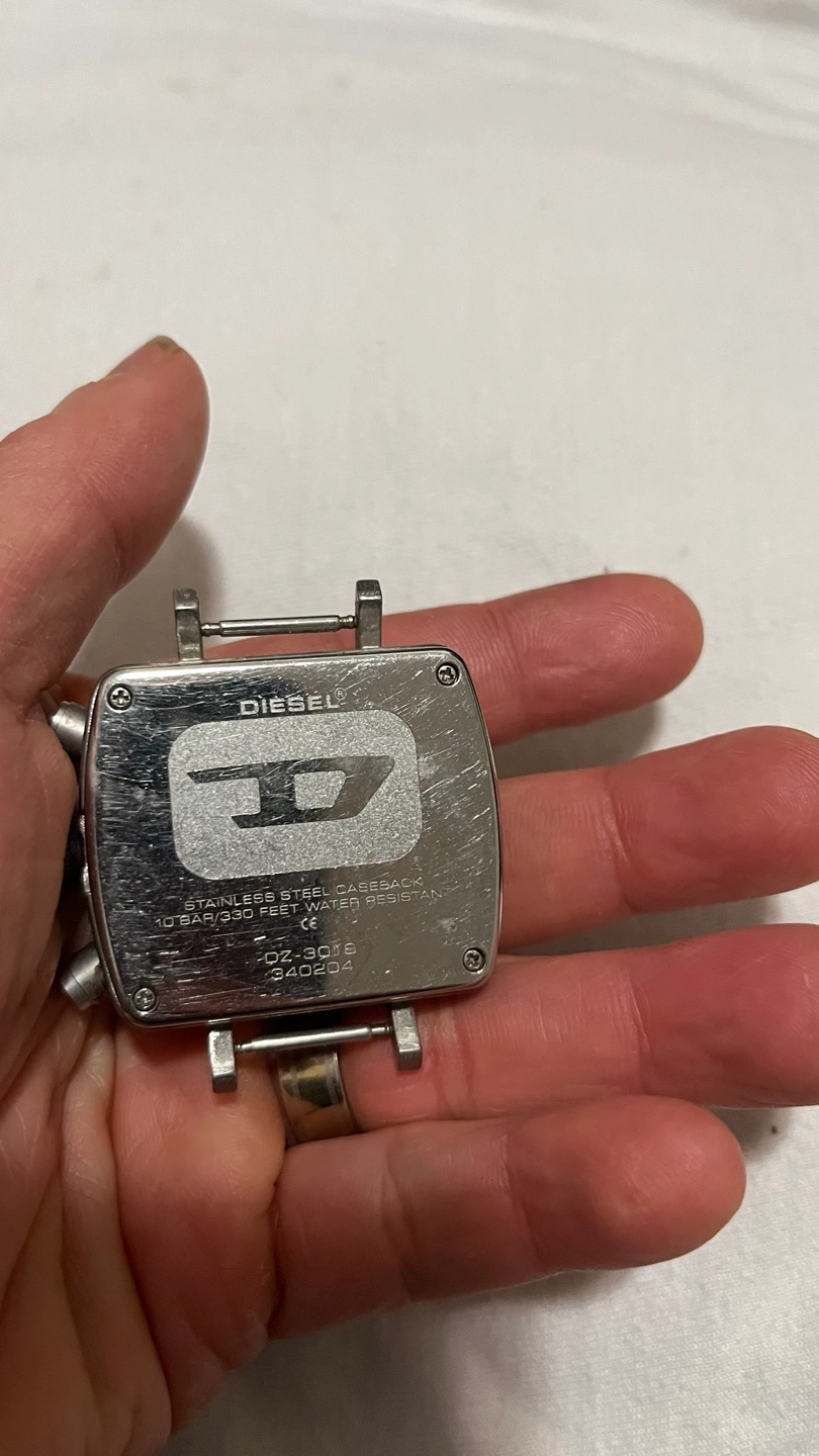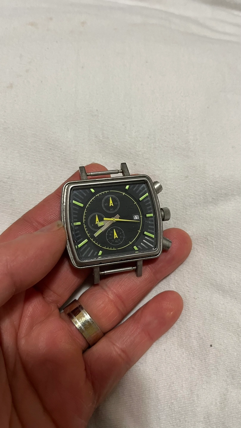 Square face chronograph watch. Stainless steel case and band. Black face with yellow accents. Pre-owned. Some scratches and wear. No strap or battery.