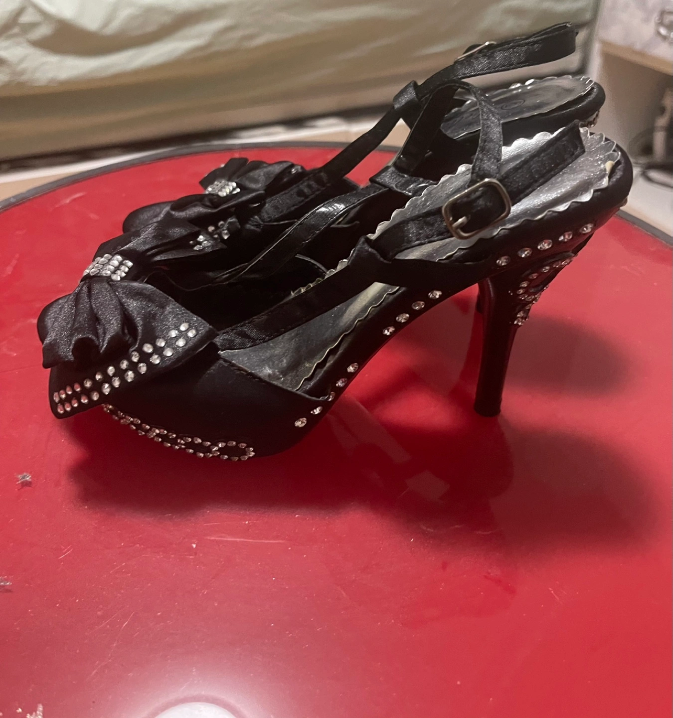 Elegant black high heels. Features a satin bow adorned with rhinestones. Ankle strap closure. Rhinestone detailing on the heel and straps. Perfect for special occasions.