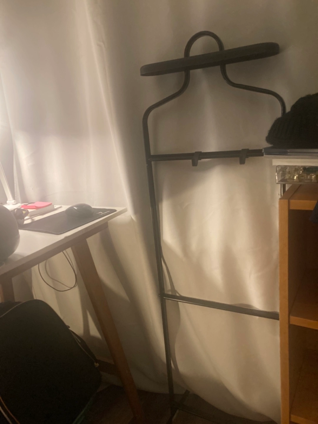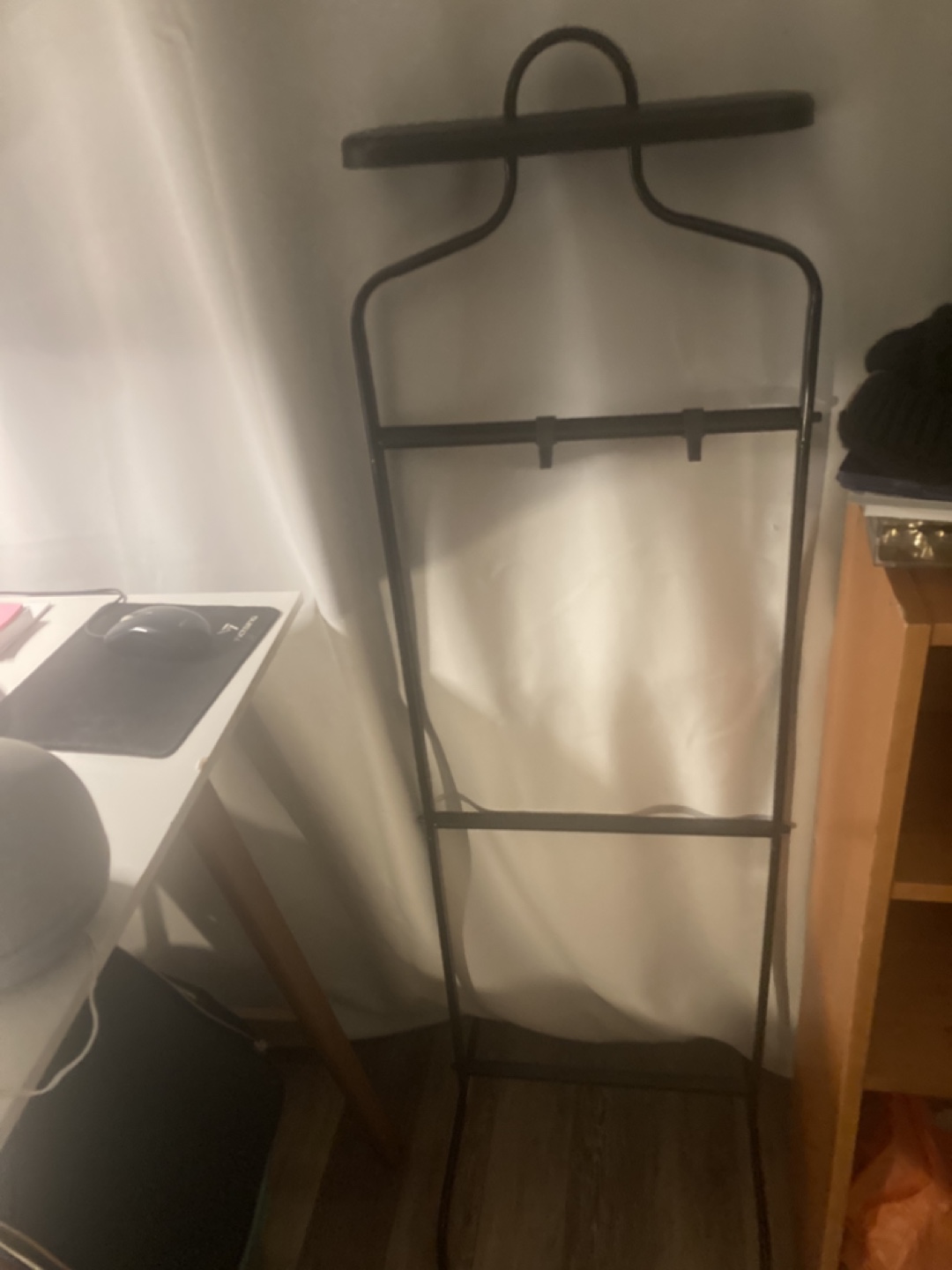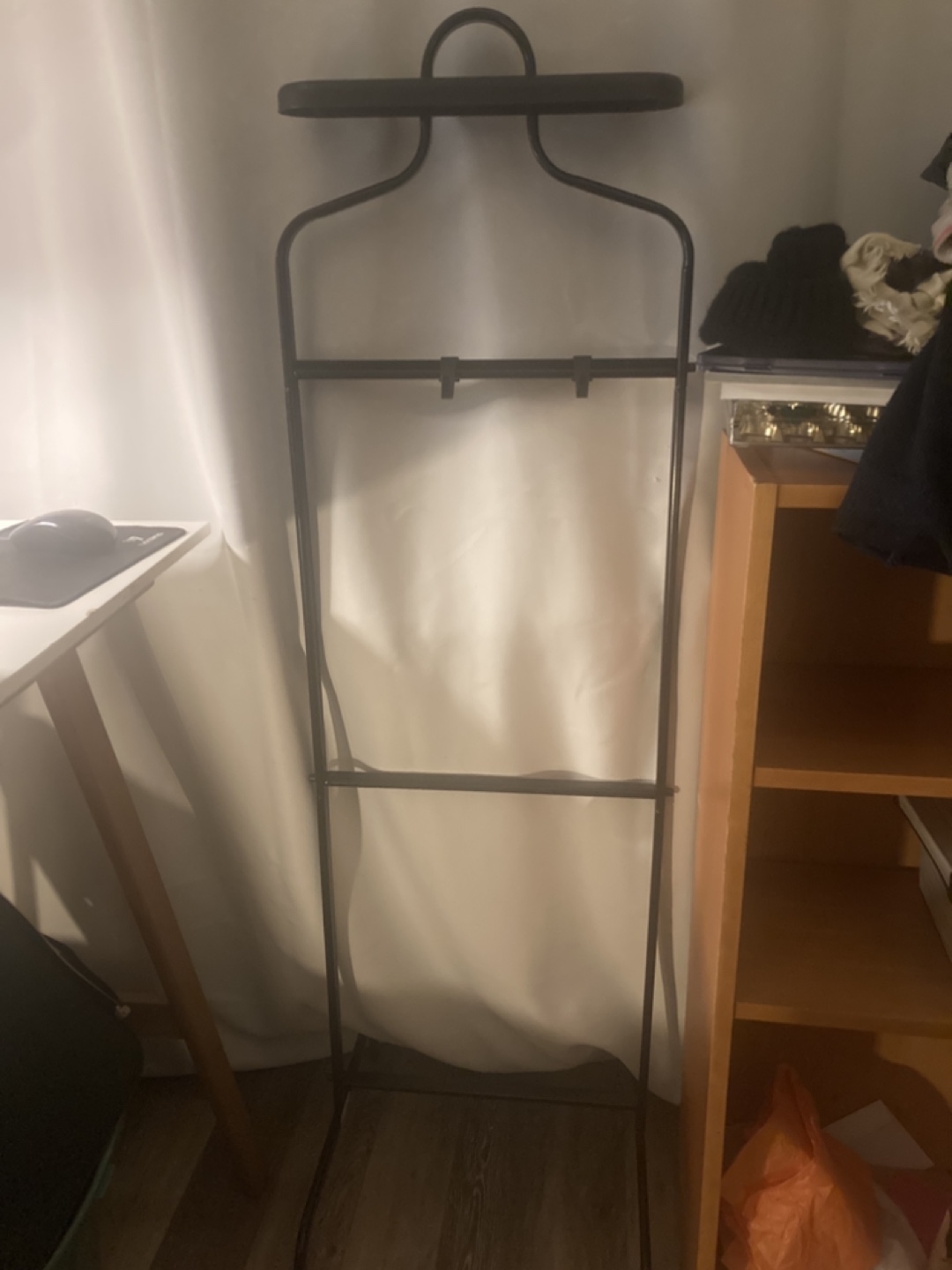Freestanding valet stand. Metal frame. Three hanging bars. Suitably sized for most garments.
