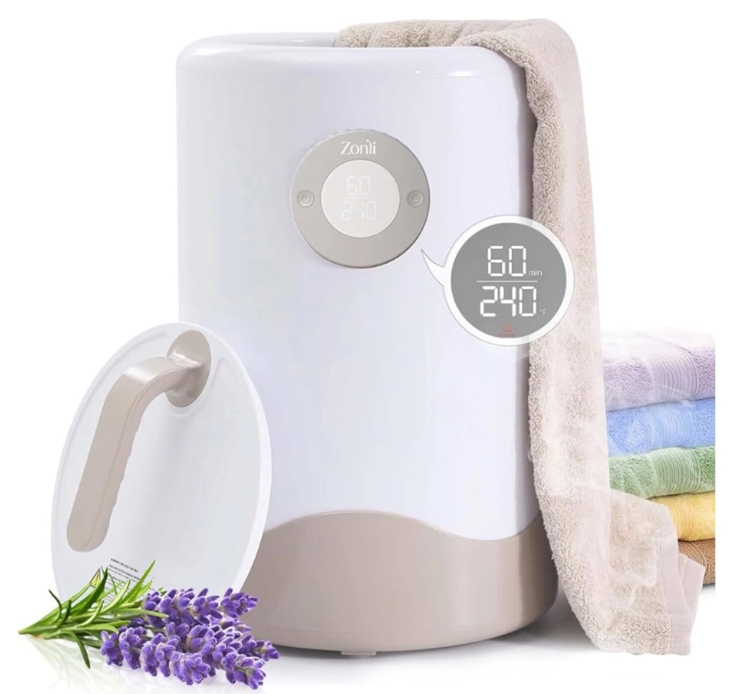 Warm, dry towels quickly. With timer. Includes lid. Compact design.