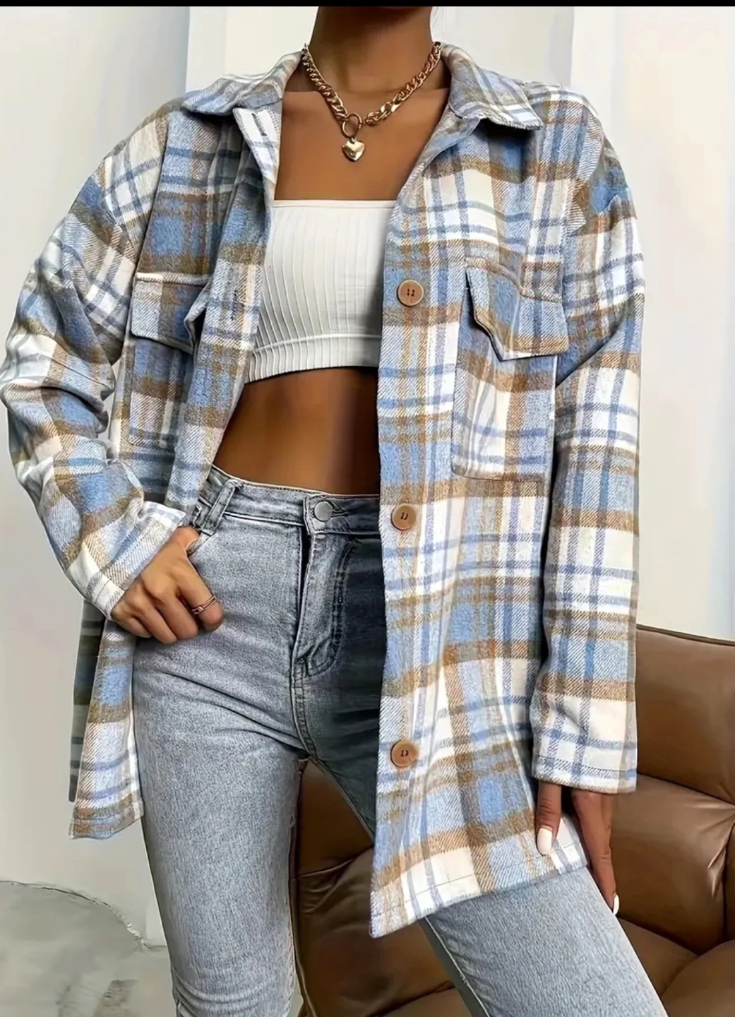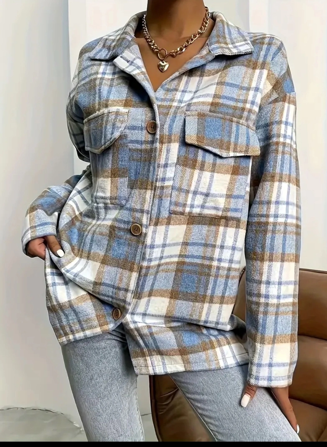 Long-sleeve button-down shirt jacket. Oversized fit. Blue, white, and brown plaid pattern. Two chest pockets. Soft and comfortable material. Perfect for layering.