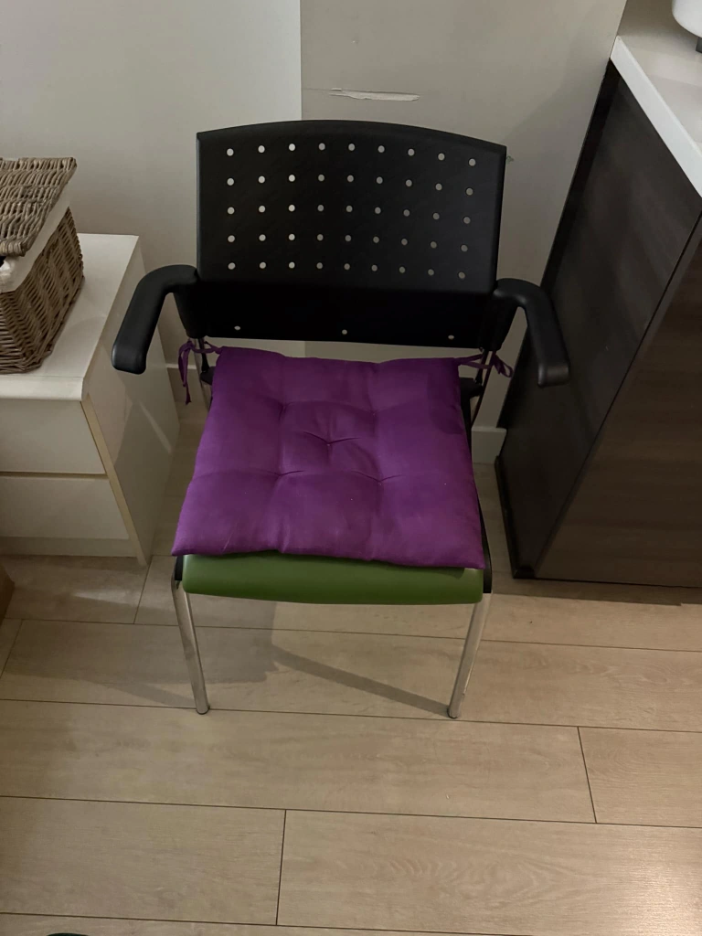 Stylish and very comfortable 1pc chair, black plastic shell, silver legs, purple cushions. Armrests included.