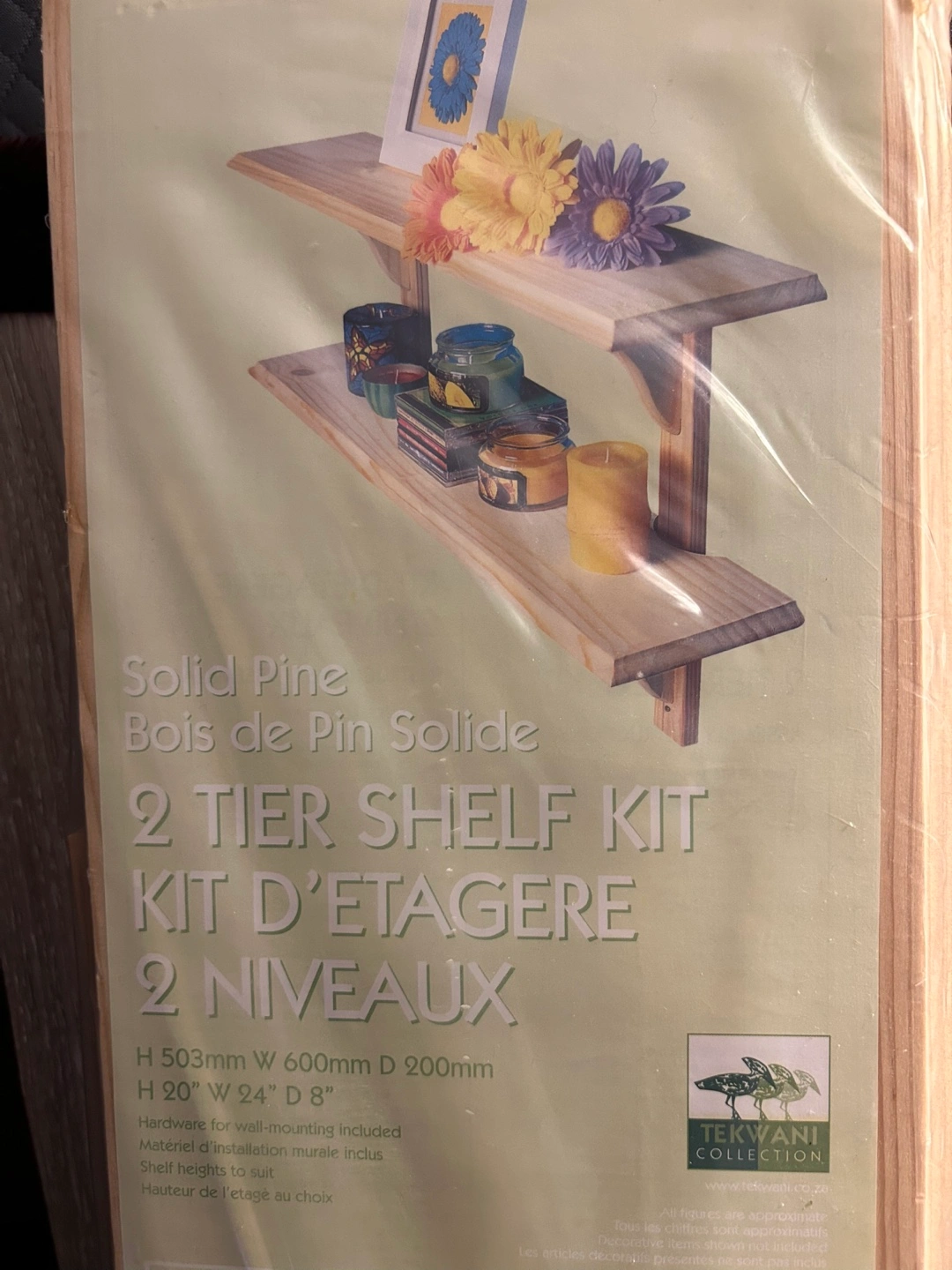 New in box. Solid pine wood. Two-tier shelf kit. Includes hardware for wall mounting. Dimensions: H 503mm W 600mm D 200mm (H 20" W 24" D 8").