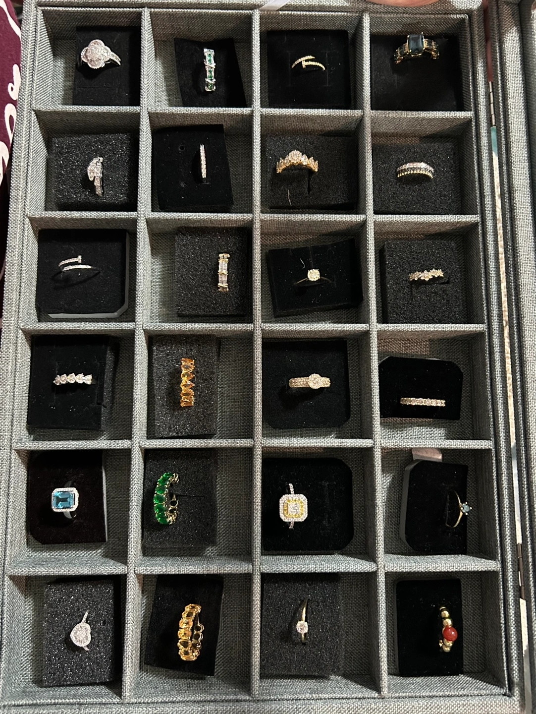 Collection of rings in a grey fabric-covered organizer. Various styles and gemstones. Every ring has a different price. Comes with authenticity card.