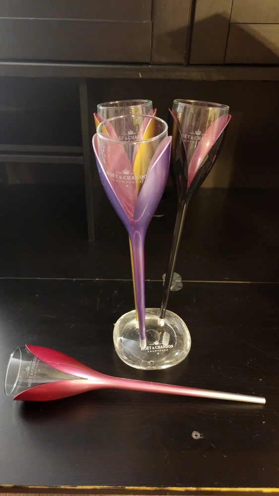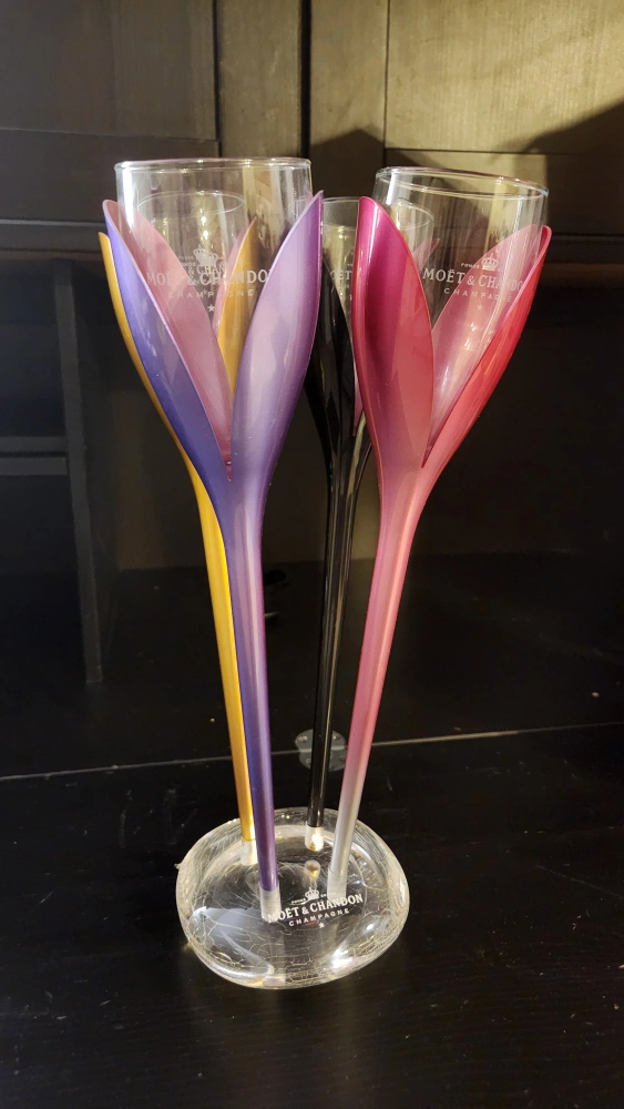 Set of four unique tulip-shaped champagne glasses. Three glasses are displayed on a stand, one is separate. Rose, black, and purple colours. Comes in original box.