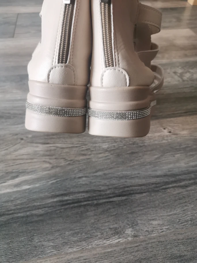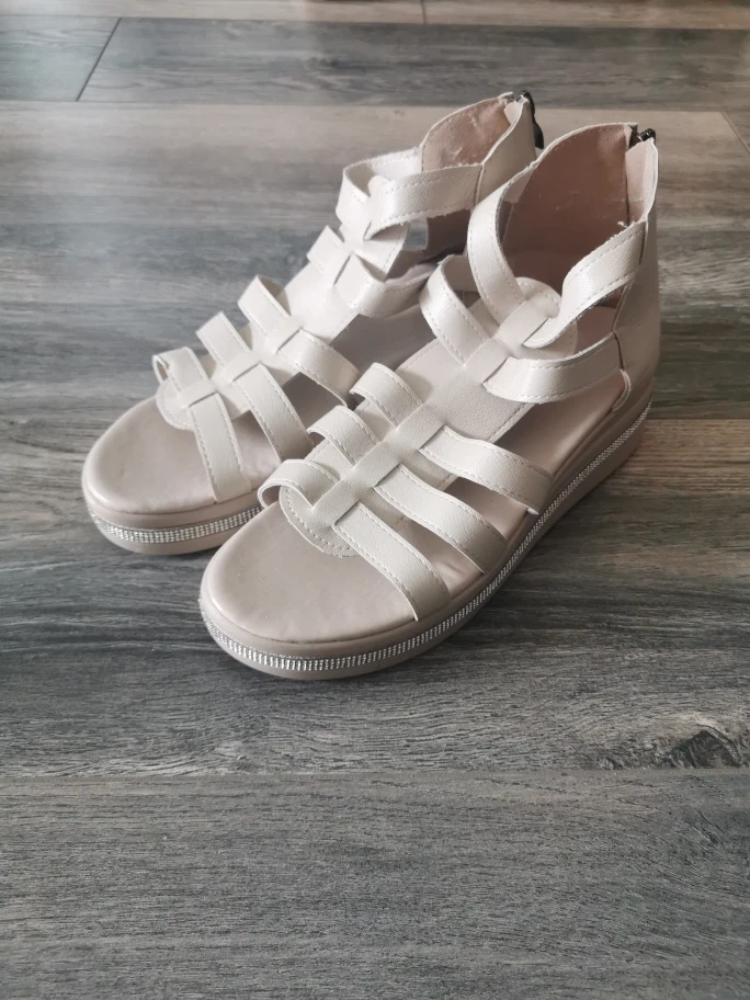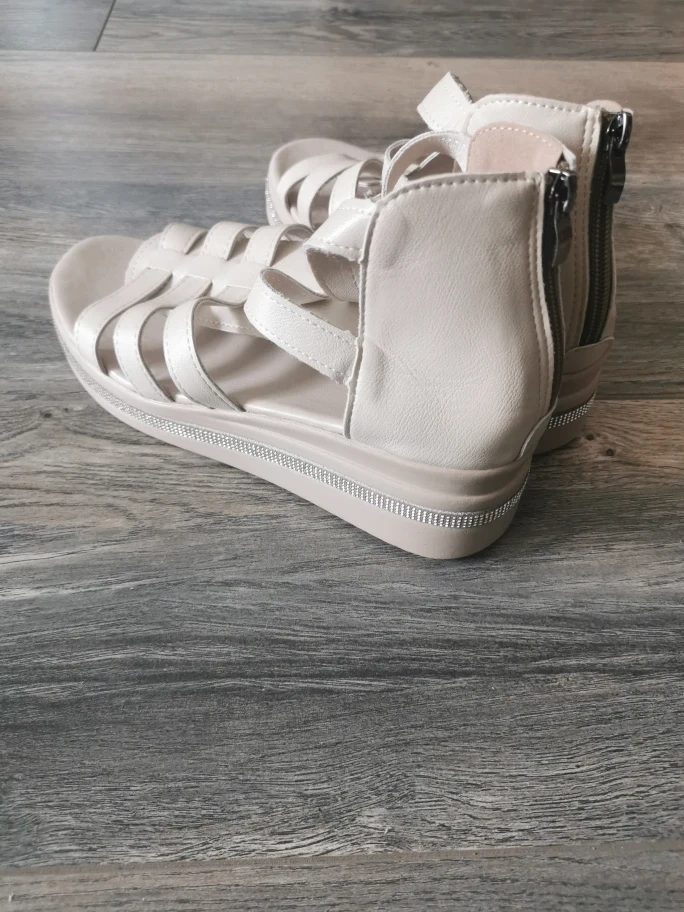 Stylish beige gladiator sandals. Features a chunky platform wedge heel and back zipper closure. Size 40.