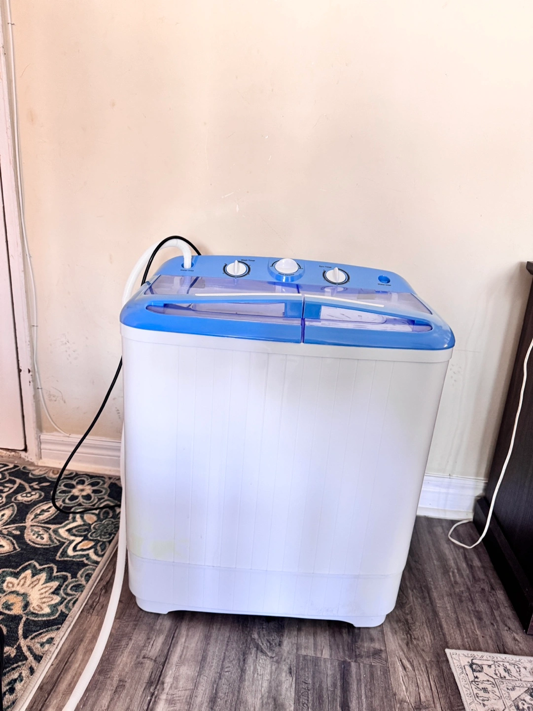 Compact laundry solution. Two tubs; one for washing, one for spinning. Features adjustable wash and spin timers. Includes hoses. Great for apartments or RVs.
