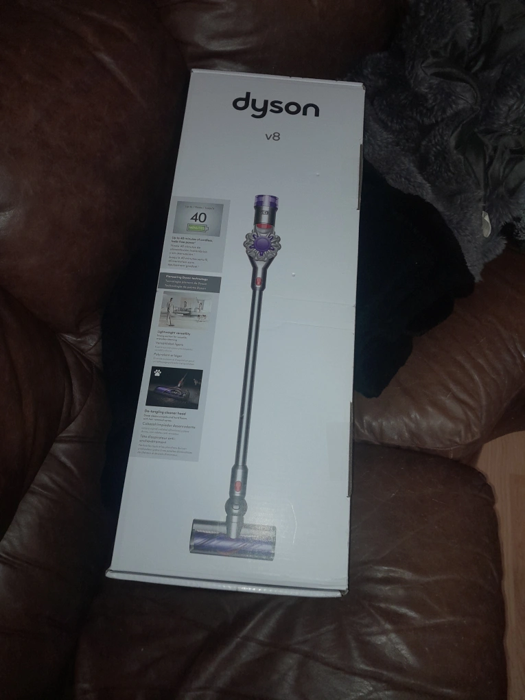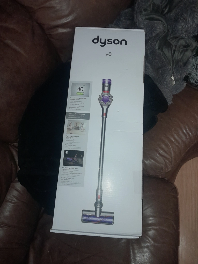 Brand new, unopened Dyson V8 cordless stick vacuum. Includes multiple attachments. Powerful suction. Lightweight and easy to use. Perfect for homes with pets and allergies.