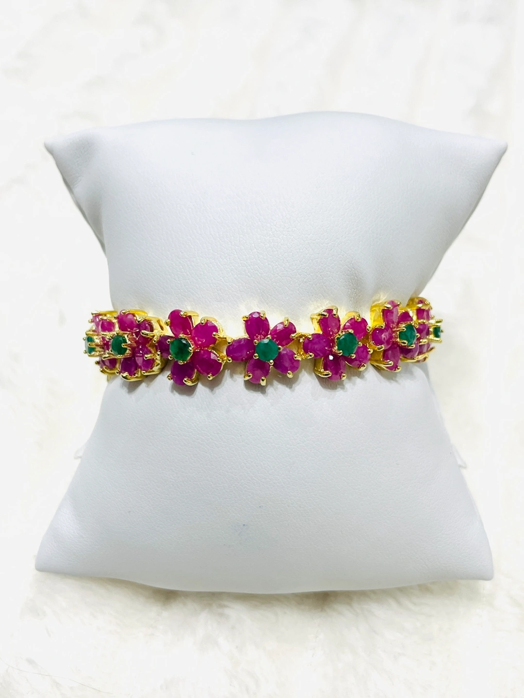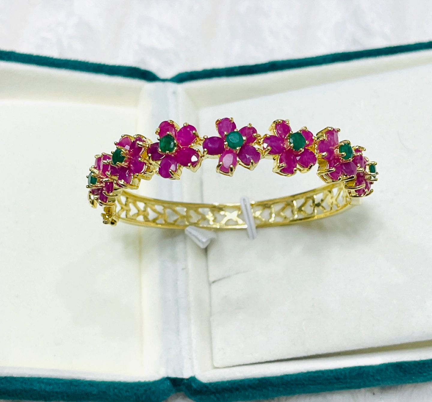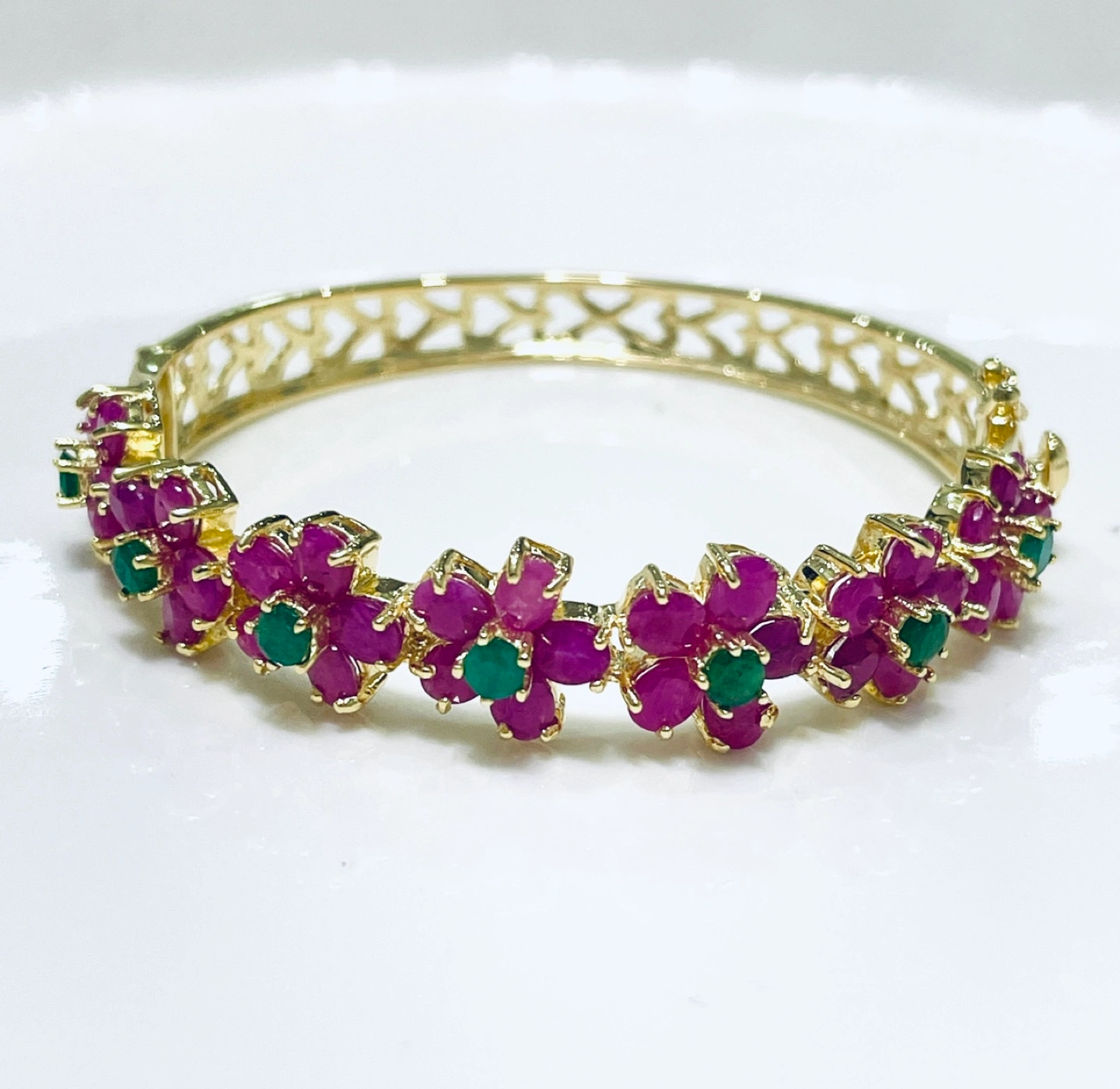 The Sterling silver 14K Yellow Gold Plated Bangle is a stunning piece of handcrafted jewelry, designed for elegance and sophistication. Measuring 2.1 inches in size, this unique bangle features seven intricately crafted floral motifs, each adorned with five oval-cut rubies (4x3mm), totaling 35 rubies. At the center of each flower sits a vibrant 4mm emerald, adding a striking contrast to the rich red hues of the rubies.