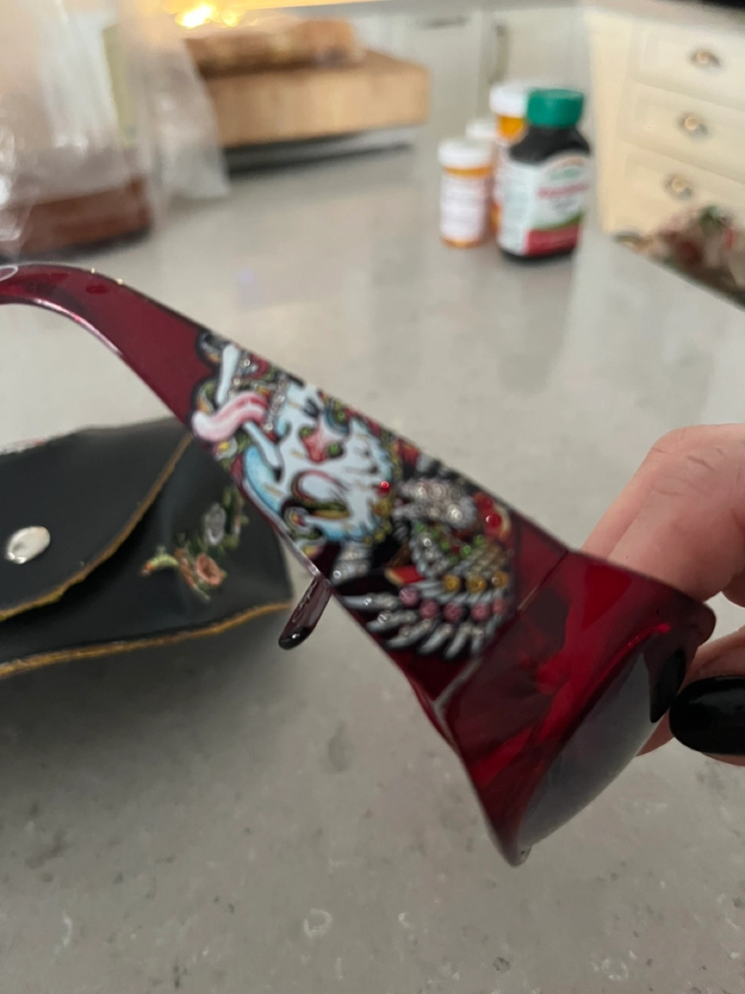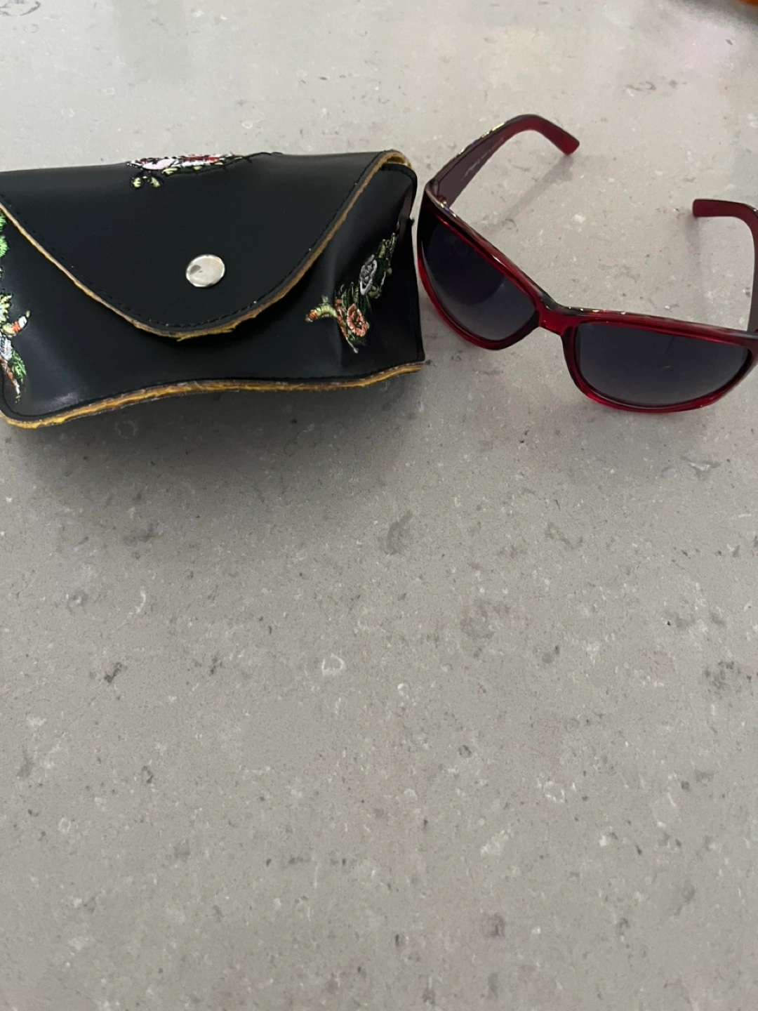 Red sunglasses. Includes a black case with gold embroidery. Made in the USA.