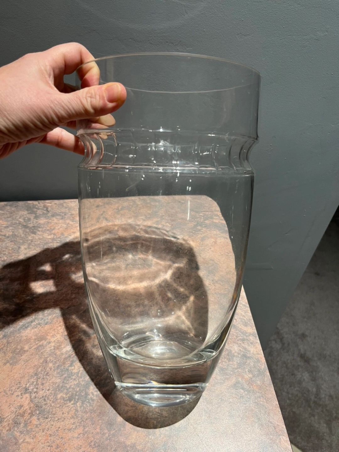 Tall clear glass vase. Features a textured mid-section. Perfect for home décor. Cash only
