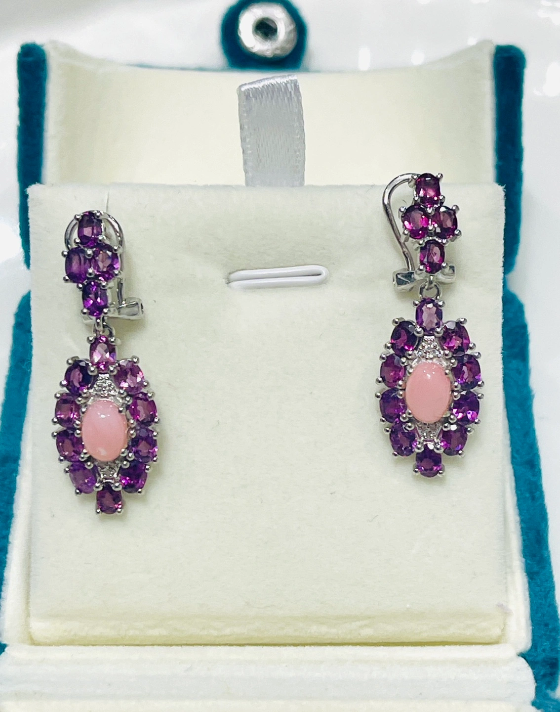 Beautiful dangle earrings. Pink opal centre stones surrounded by vibrant purple garnets. Silver-toned metal setting. Excellent for adding a touch of elegance to any outfit.