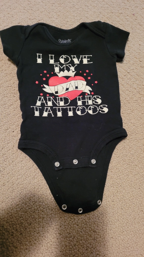365Adorable black baby bodysuit. Features a graphic print: 'I love my dad and his tattoos'. Snap closures. Short sleeves.