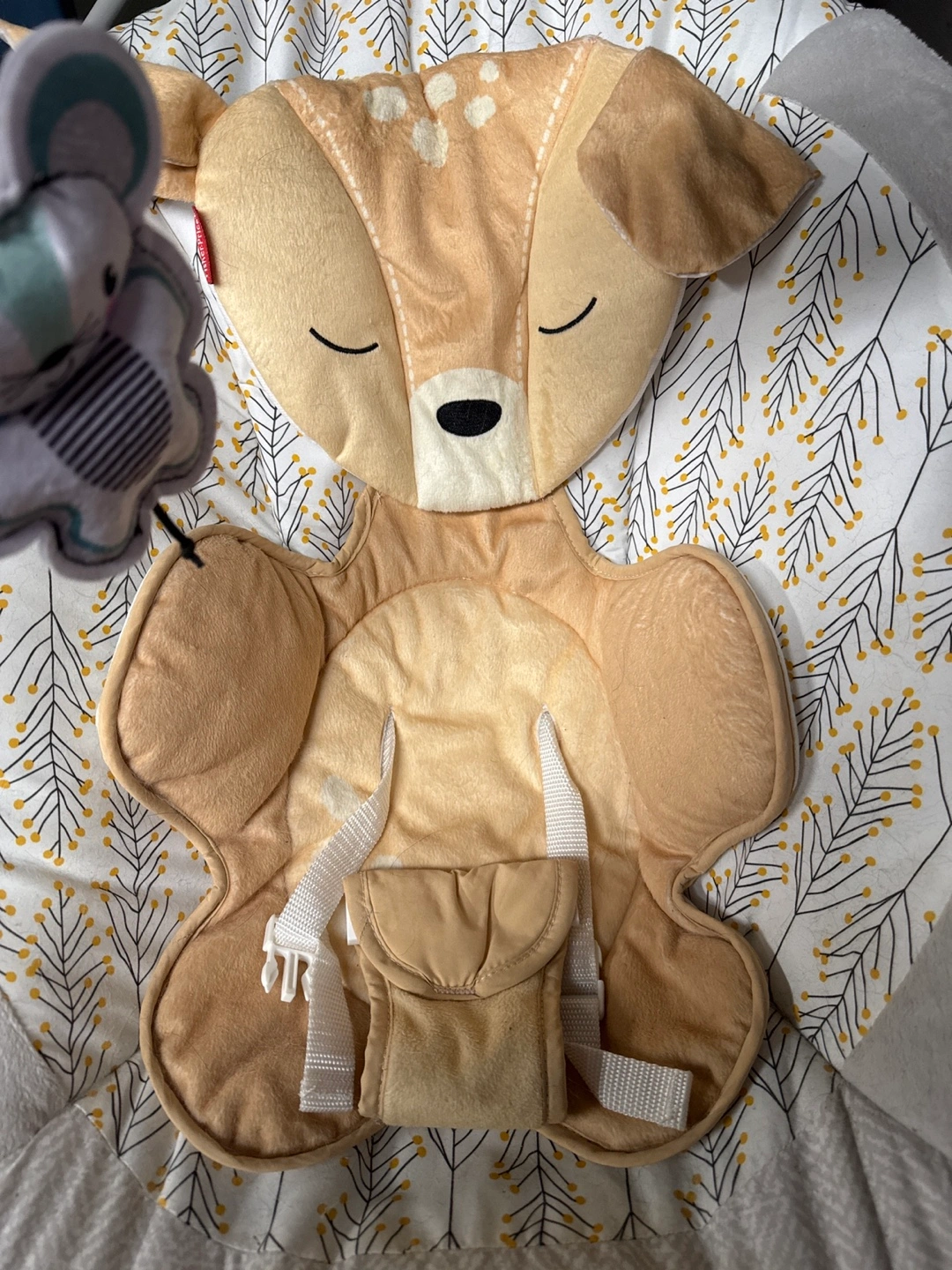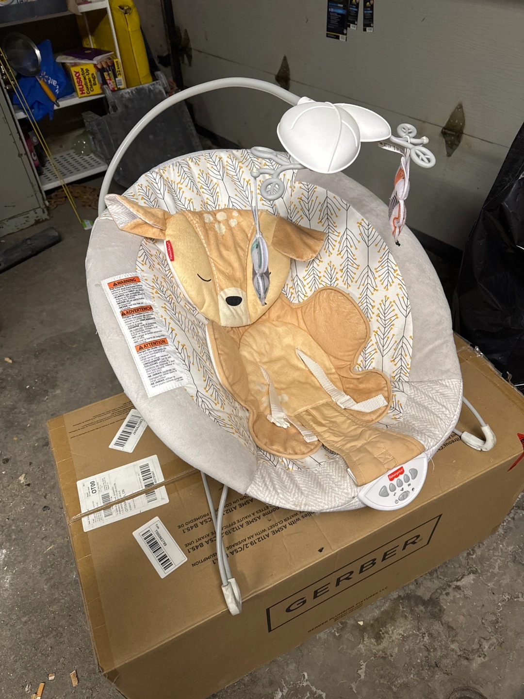 83Adorable deer design. Features multiple vibration and swing settings. Includes overhead mobile. Great condition.