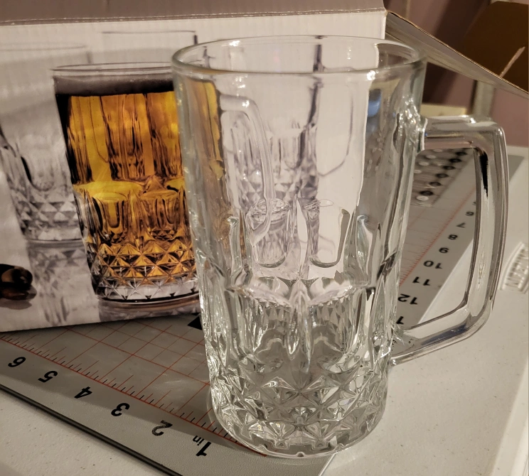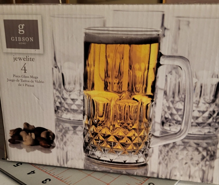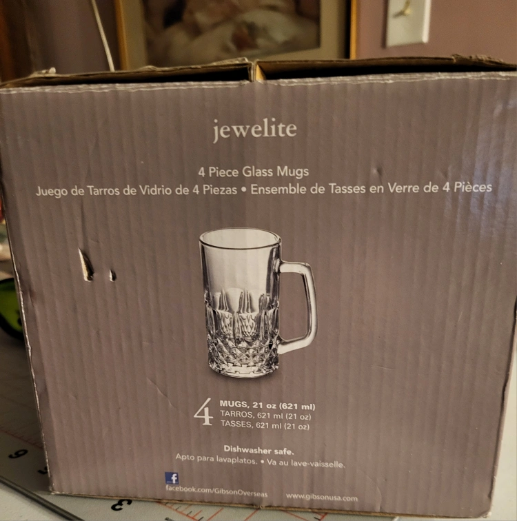 70Set of four clear glass mugs. Diamond-patterned design. Dishwasher safe. 21 ounce capacity. New in box. All Sales Final. No returns. Cash only please. Thanks.