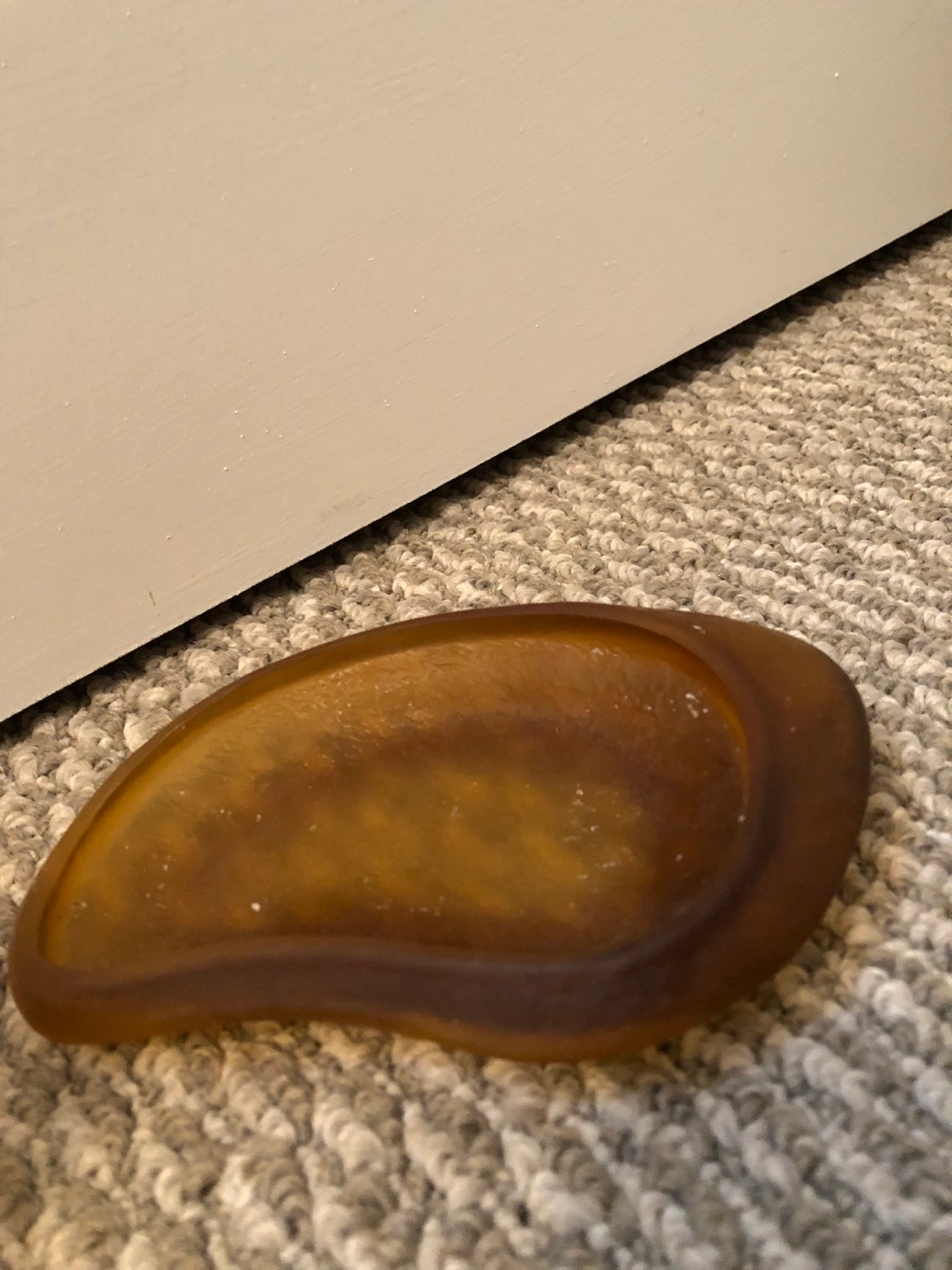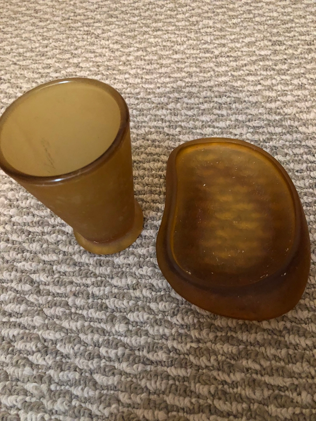 Cute amber glass bathroom set. Includes a tumbler and a matching soap dish. By Umbra. Perfect for a vintage or modern bathroom.