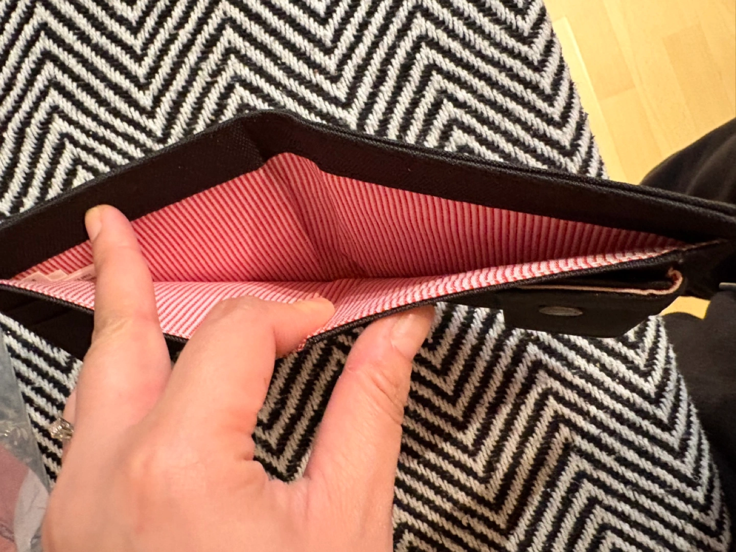 Herschel black canvas bi-fold wallet. Multiple card slots and a small coin pocket. Red and white striped interior.