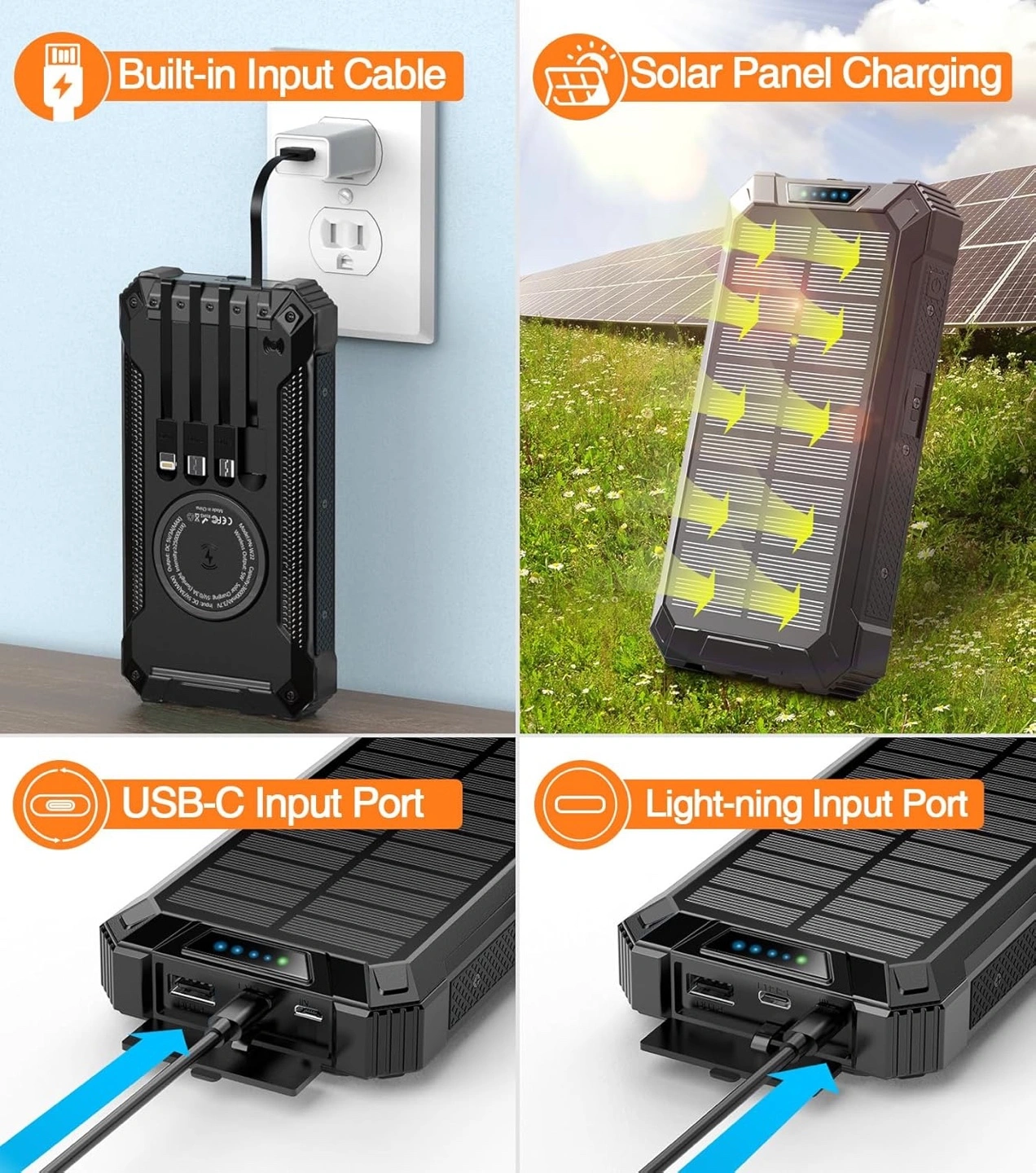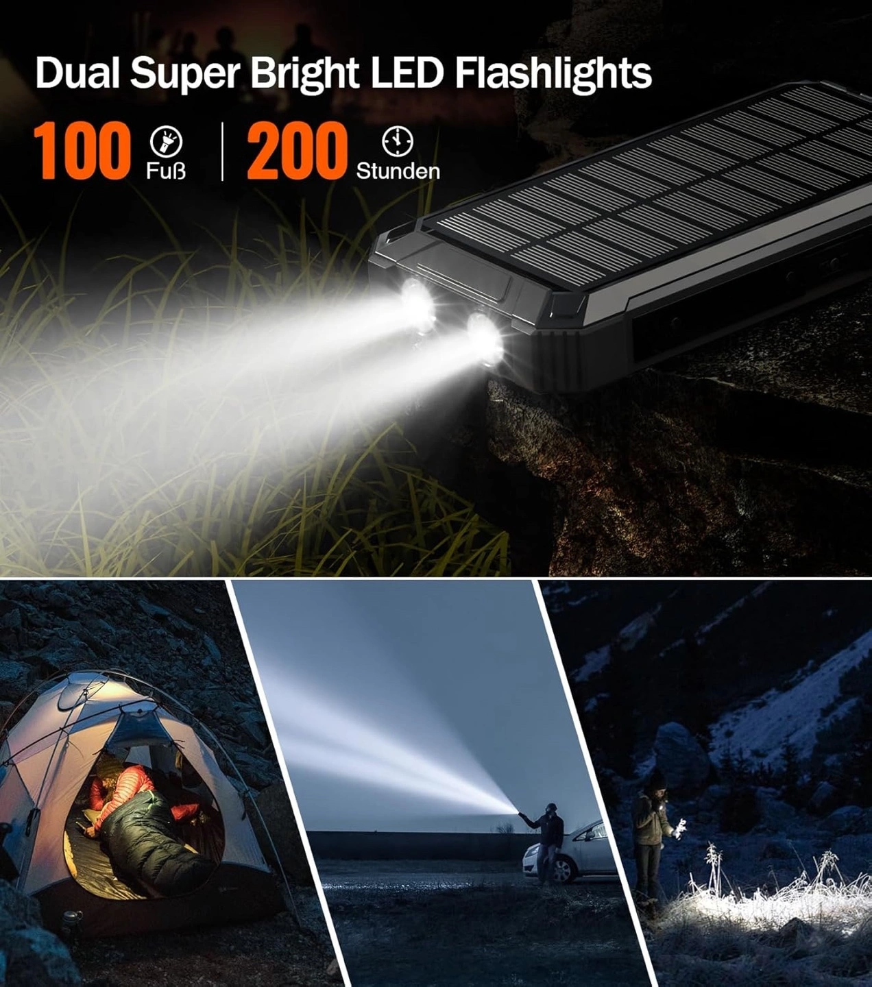 81Powerful portable charger. Solar charging. Multiple USB ports and cables. Dual super bright LED flashlights. Great for outdoor adventures and emergencies.