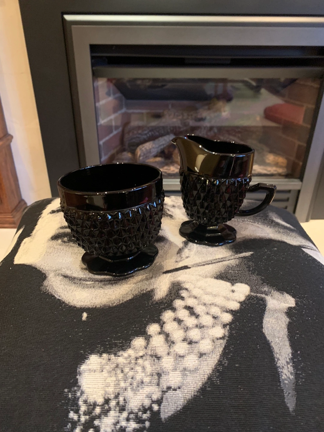 Absolutely stunning vintage Indiana glass, Tiara Black Diamond Point creamer and open sugar bowl set. Bases are ruffled in design. Set is in mint condition! Elegant and stylish, perfect for adding a touch of vintage charm to your kitchen. Too good to be in a cupboard, needs to be displayed on your counter or buffet. Just gorgeous!π€π€