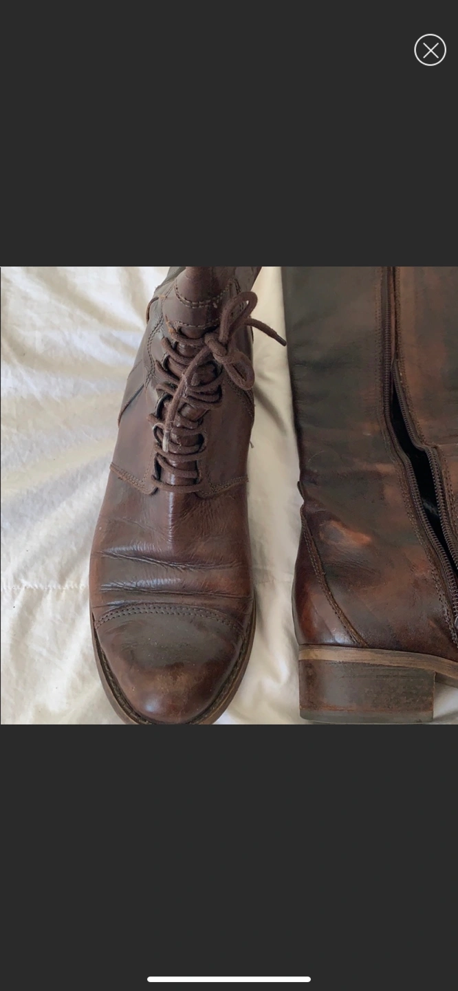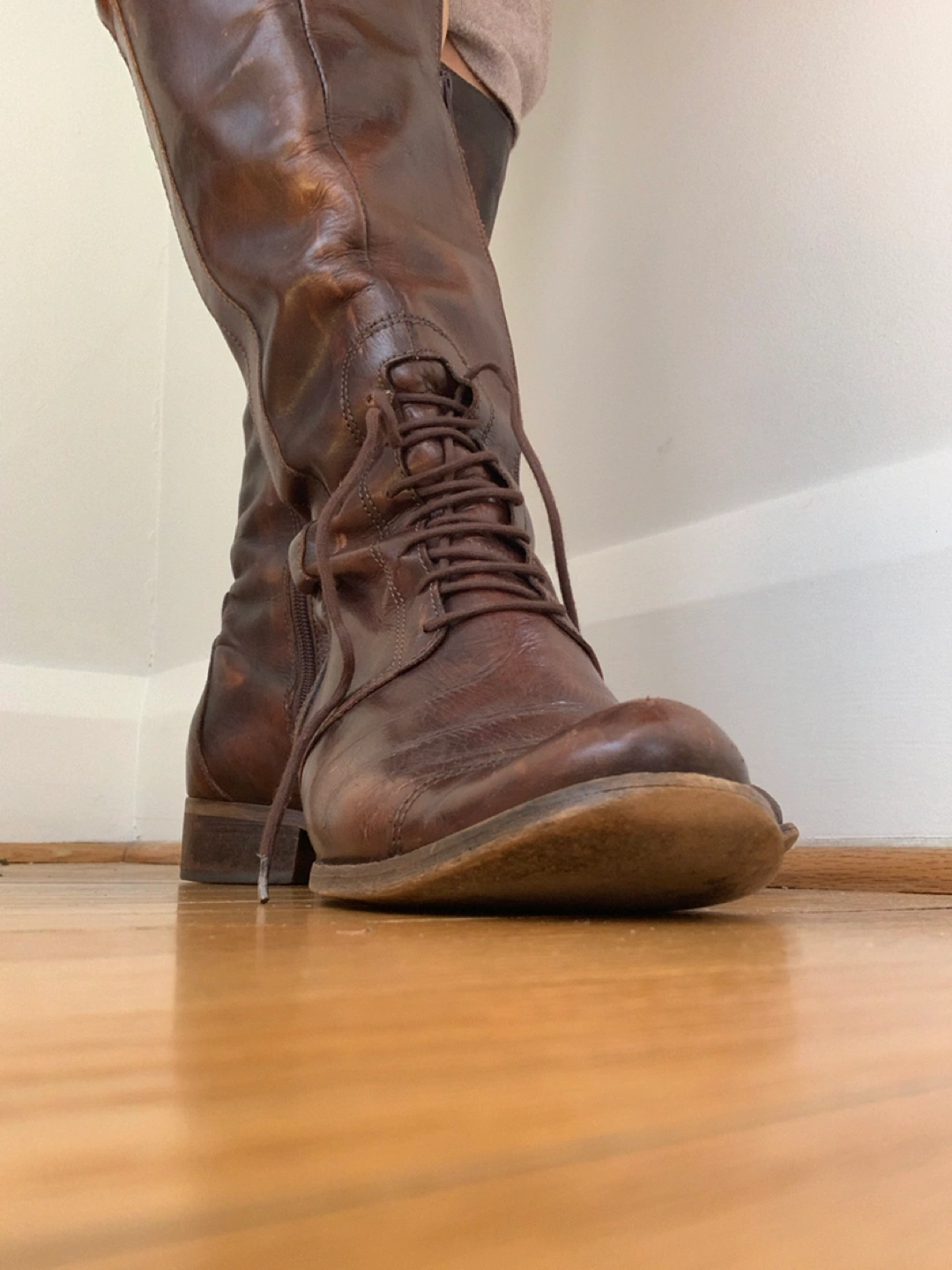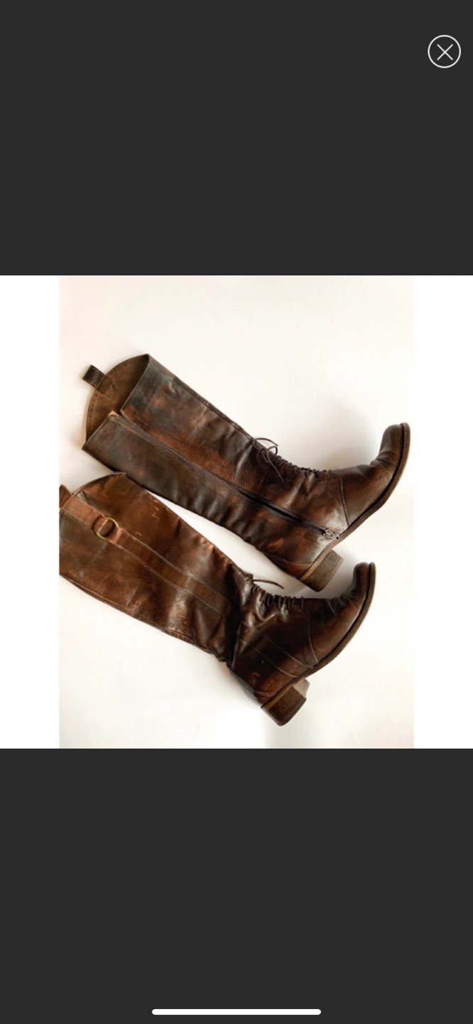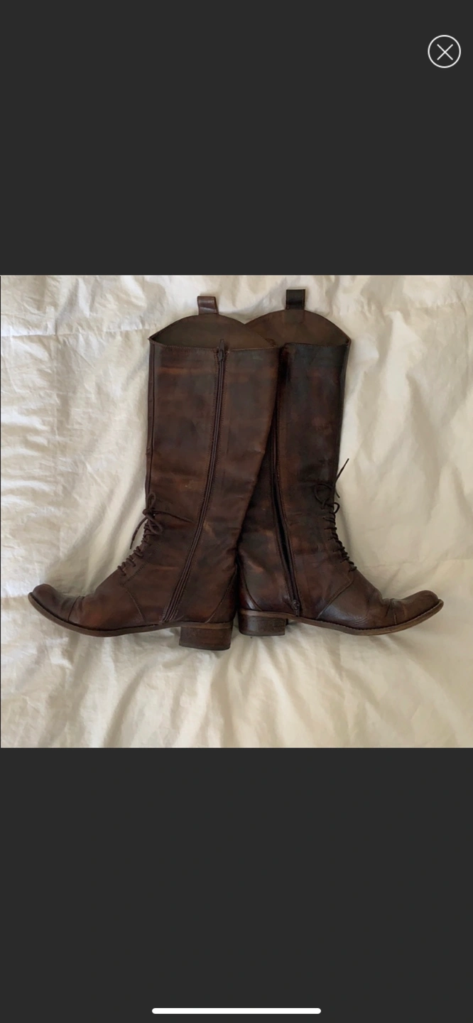 * Style: knee high leather brown boots, front laces, zippered sides, city chic, European style, equestrian chic