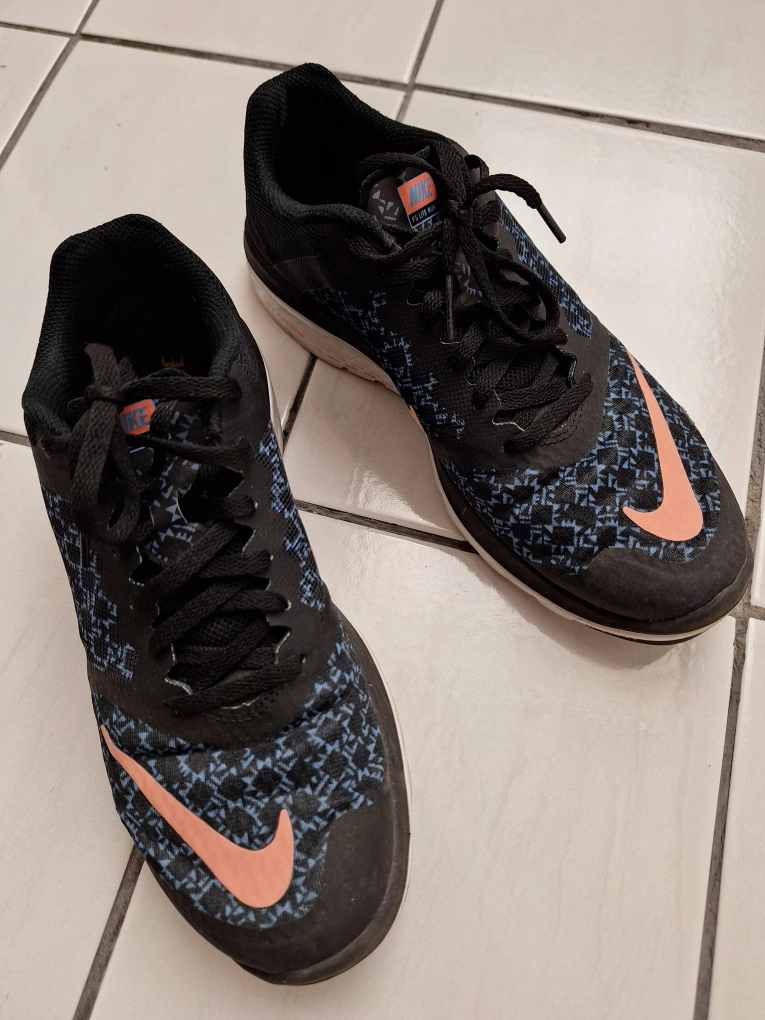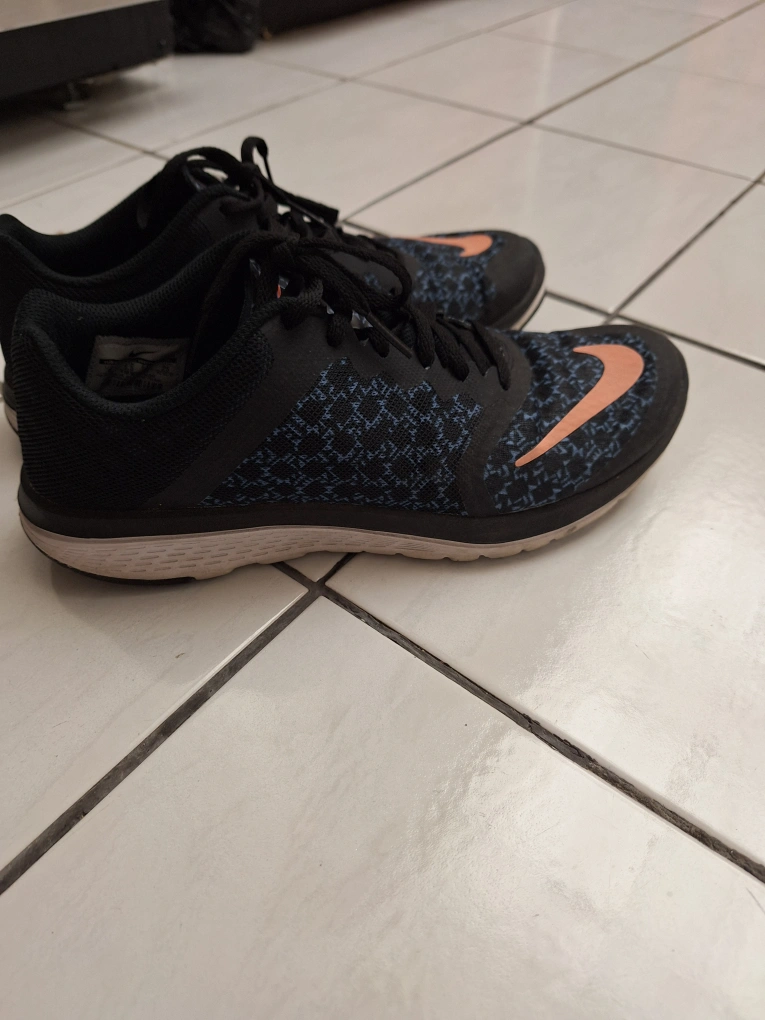 Women's Nike running shoes. Black with blue and coral accents. Size US 8, UK 5.5, EUR 39. Good condition. Minimal wear. cash only, pick up at Fairview Mall T&T Supermarket