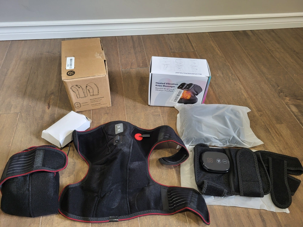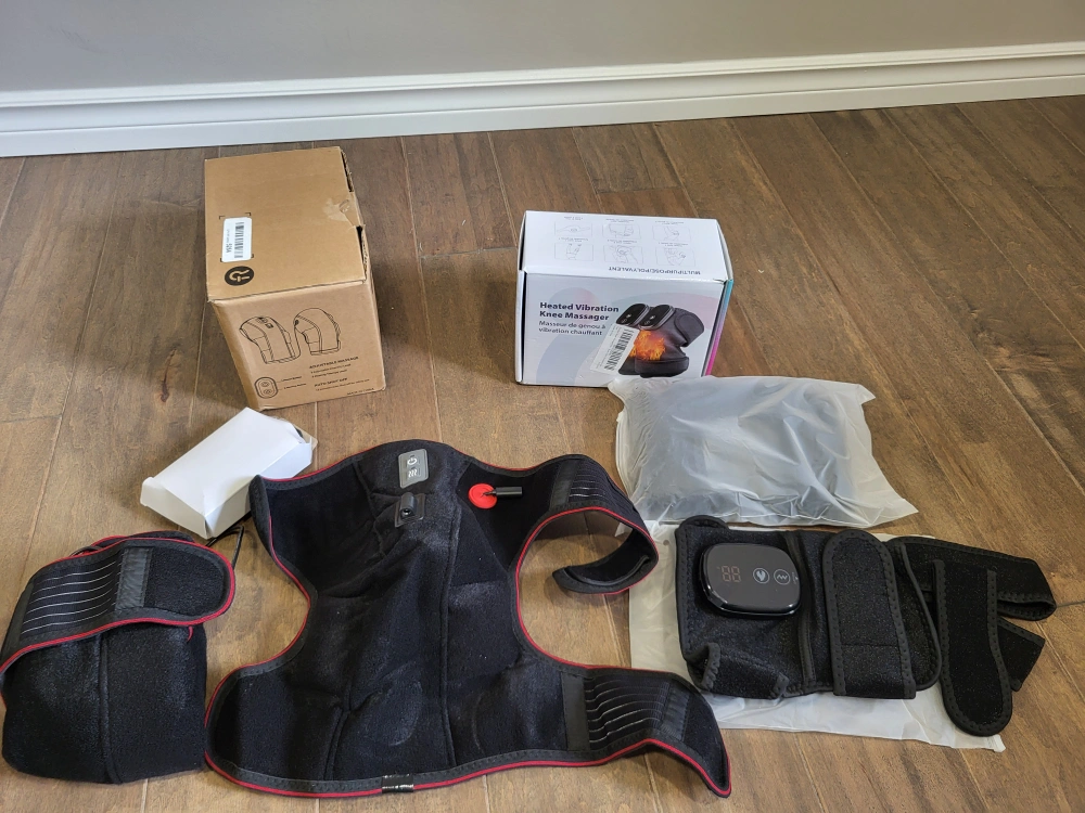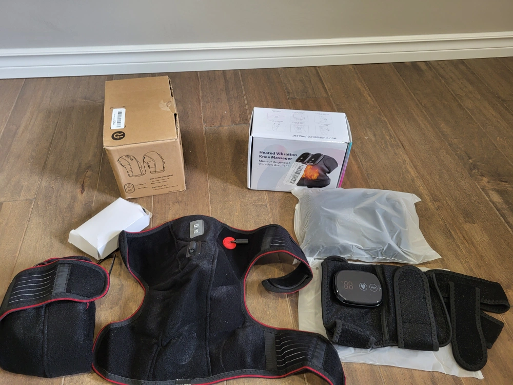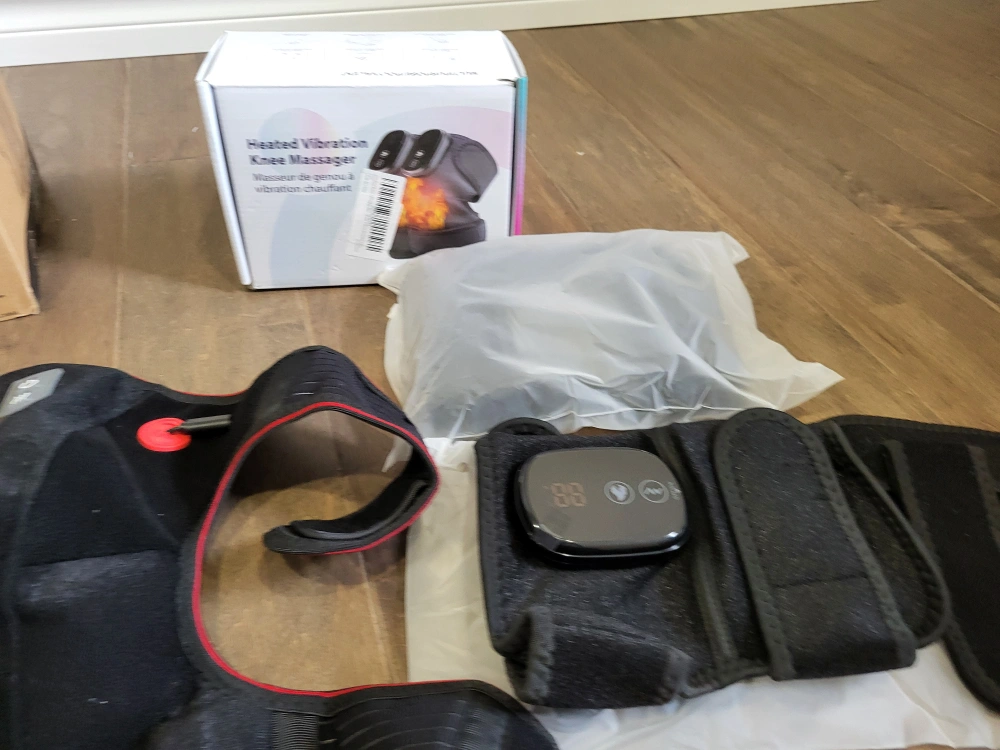 New, in box. knee and massagers. Features heat and vibration. Multiple settings. Excellent for pain relief. 2 pads/knee massage per set, cordless, wireless, rechargeable battery operated. $60 firm each.