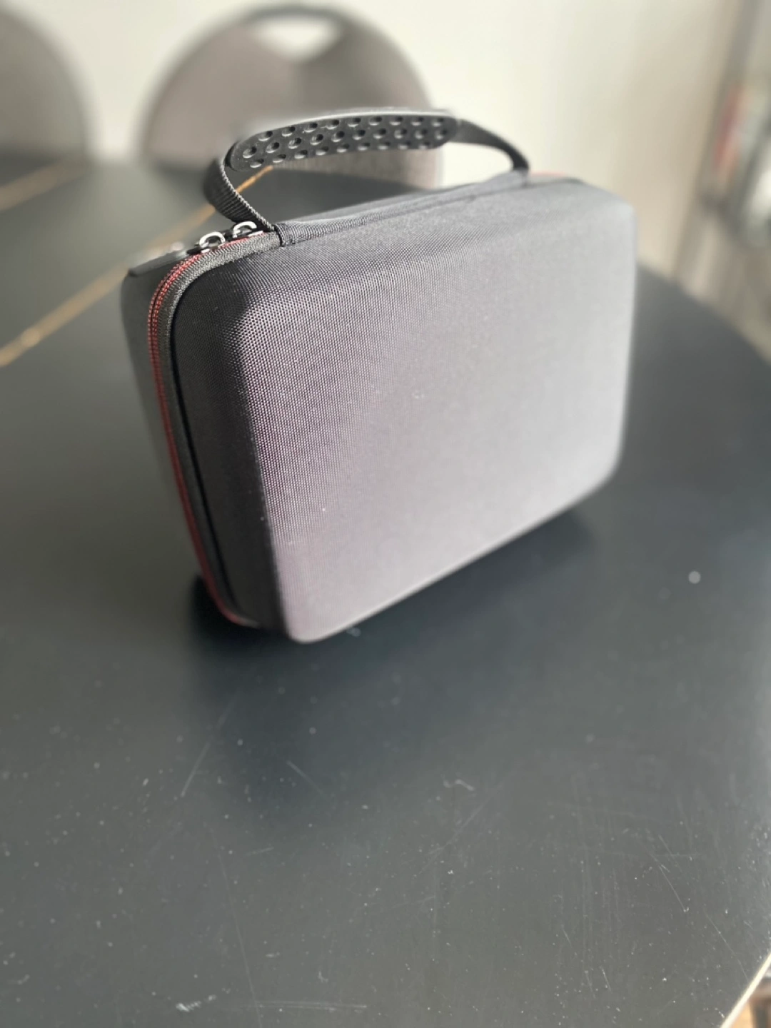 Hard carrying case. Holds two breast pumps. Features interior compartments and a zippered closure.