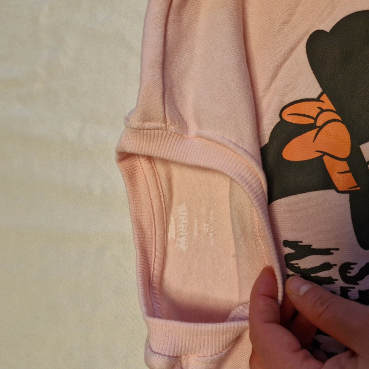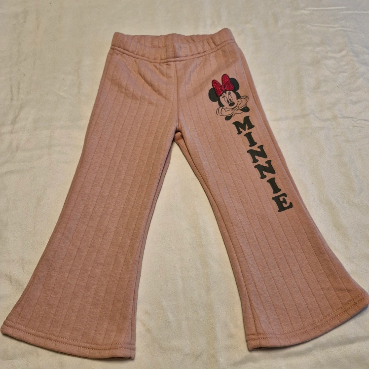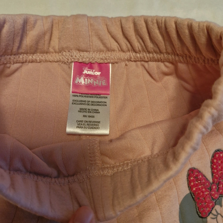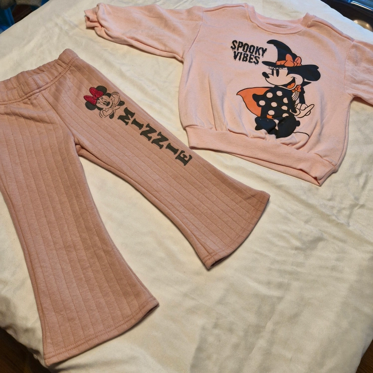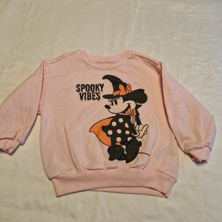 Adorable two-piece Minnie Mouse outfit. Pink sweatshirt features spooky vibes graphic. Pink pants have Minnie Mouse design. Perfect for Halloween.