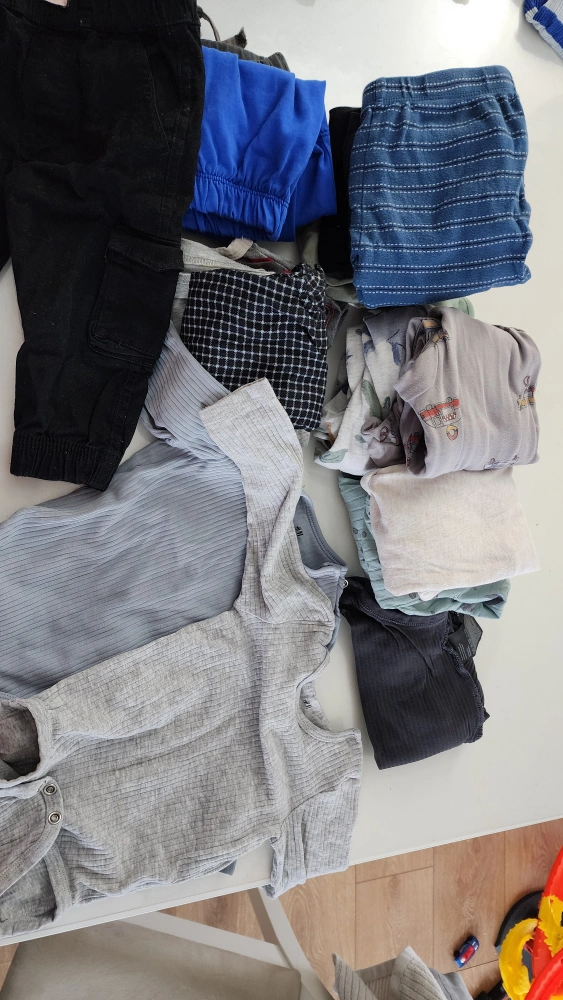 Bundle of baby boy clothes, size 6-12 months. Includes bottoms, t-shirts and sleepers. Decently used. Can be used for home wear.